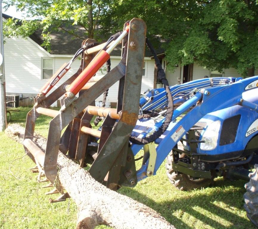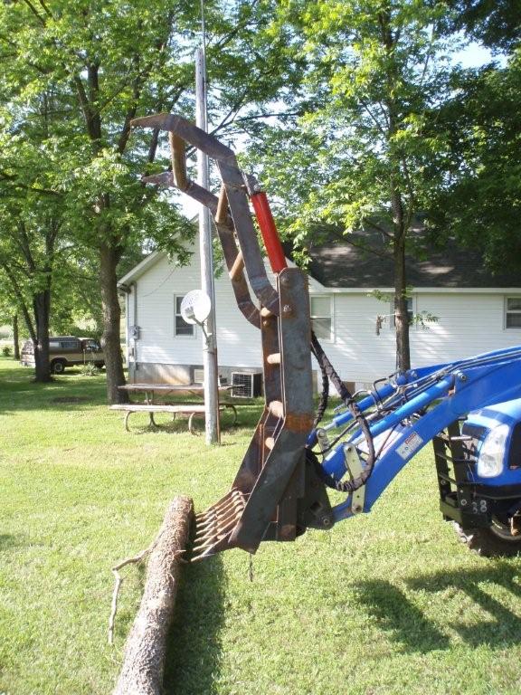 Deerehunter, Nice job. I like the open toothed design, lets dirt & rocks drop out better than a bucket grapple & keeps logs closer to the loader arms -less stress on the roll cylinders. Also like the "tree getter" bracing between the teeth. I would take a grinder & undercut them a little for better grip. What's it weigh? MikeD74T