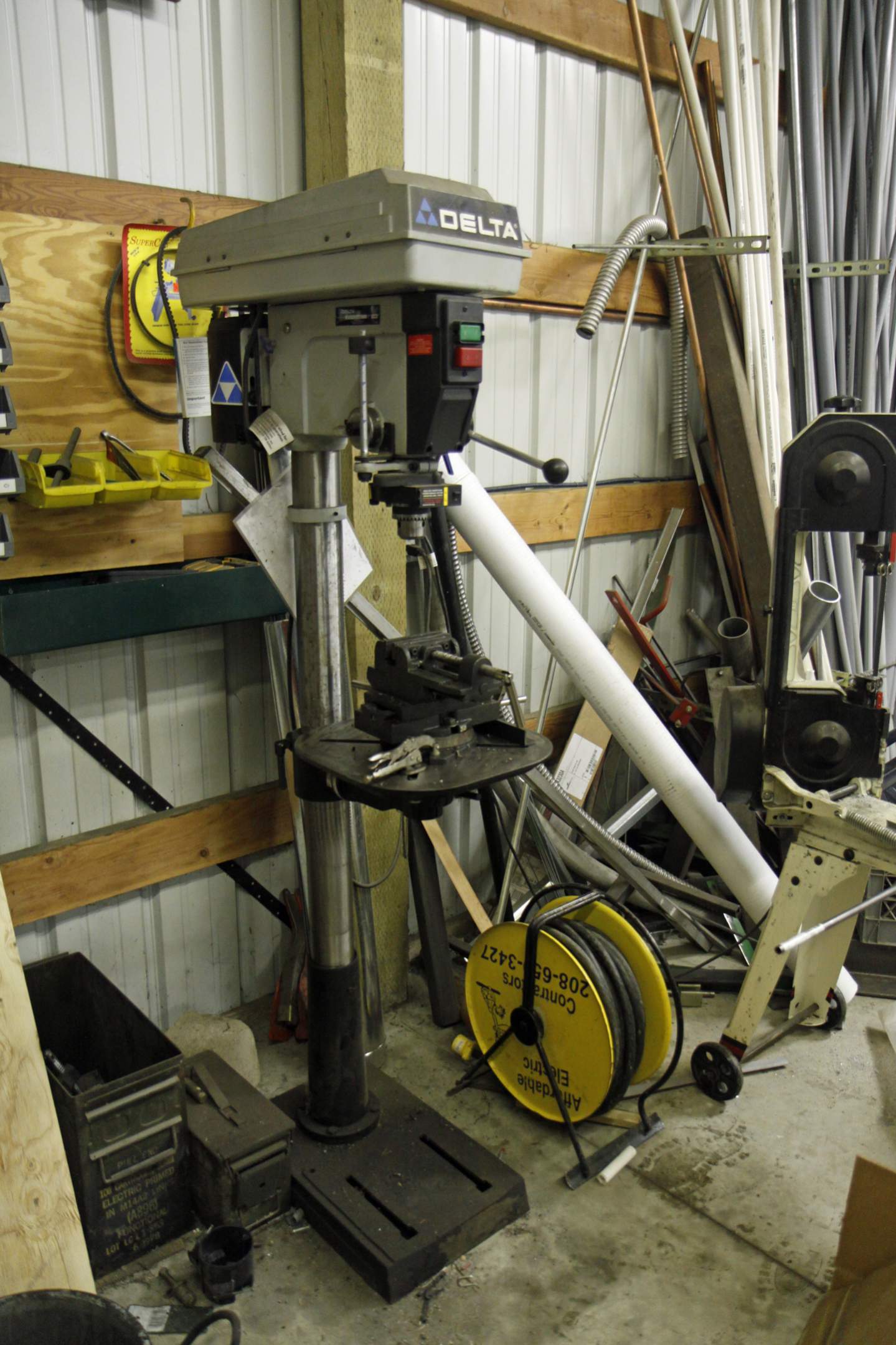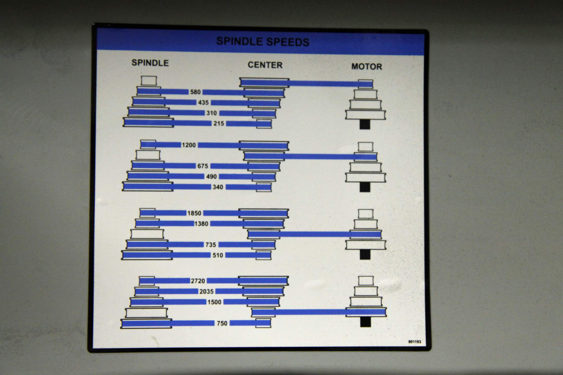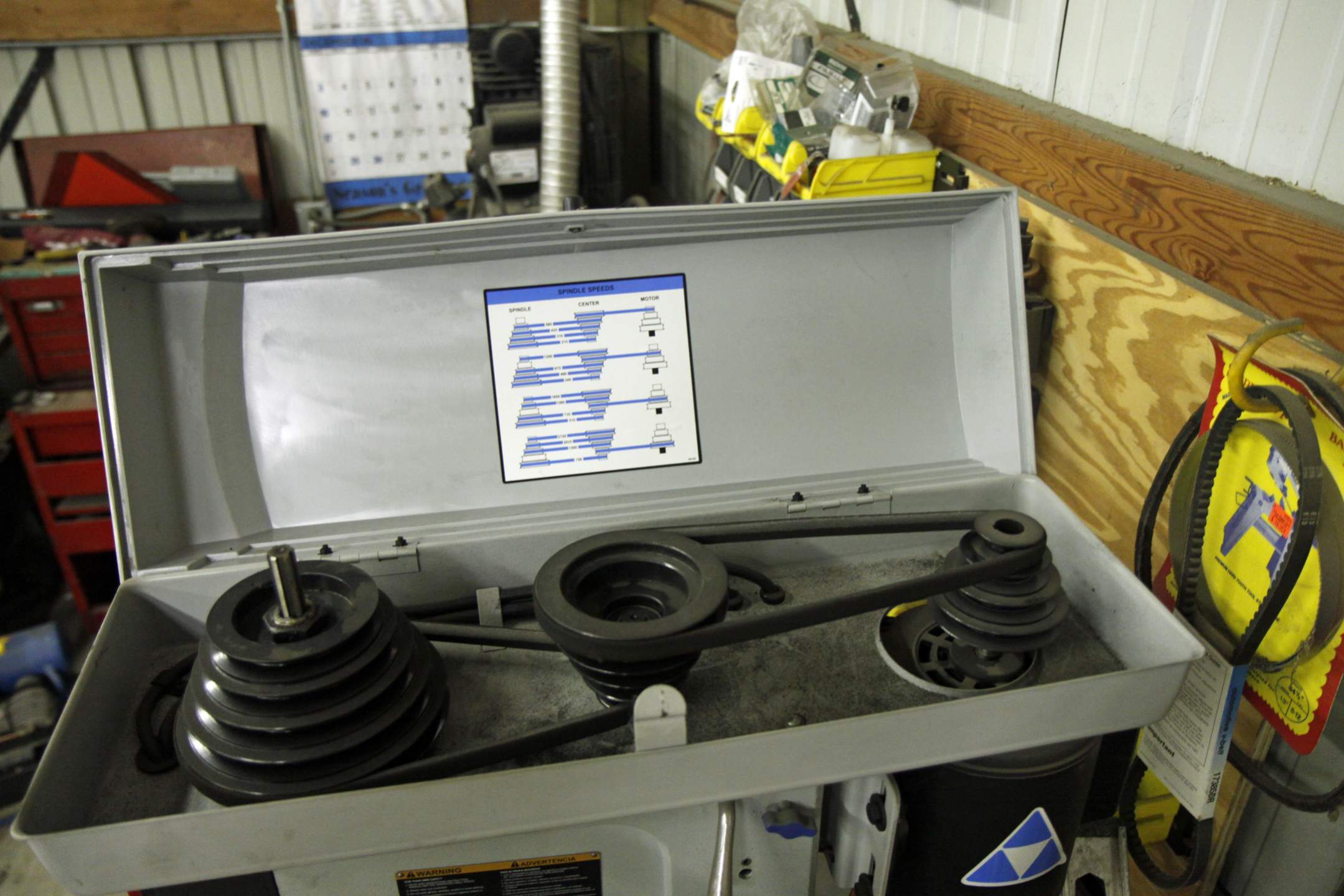I've attached a picture of the speed reduction mechanism on this bigger drill press that I bought. Some of you may be able to poach ideas from it to adjust your own. I don't know if the motor pulley can be turned upside down like this on the smaller drill presses.