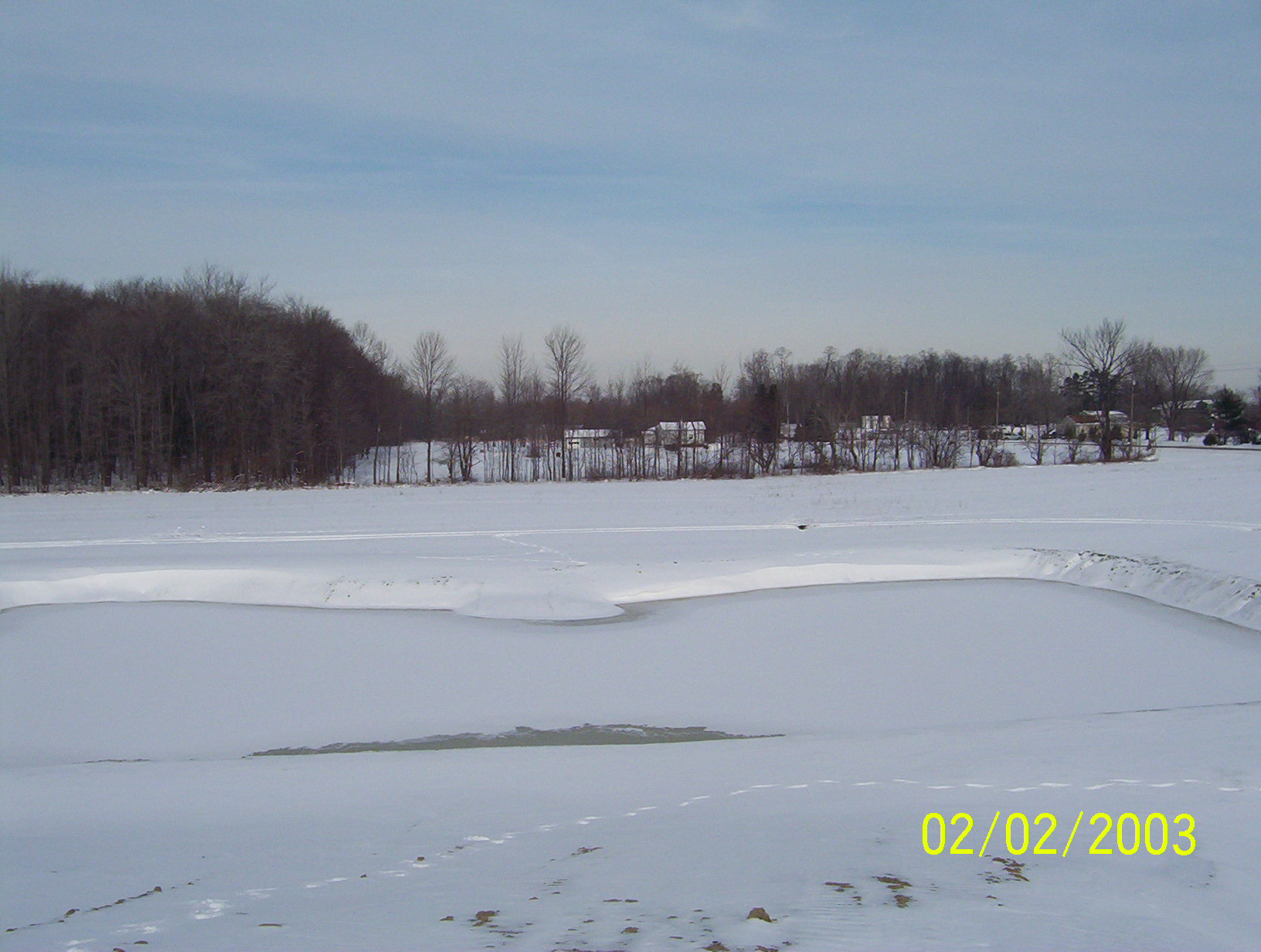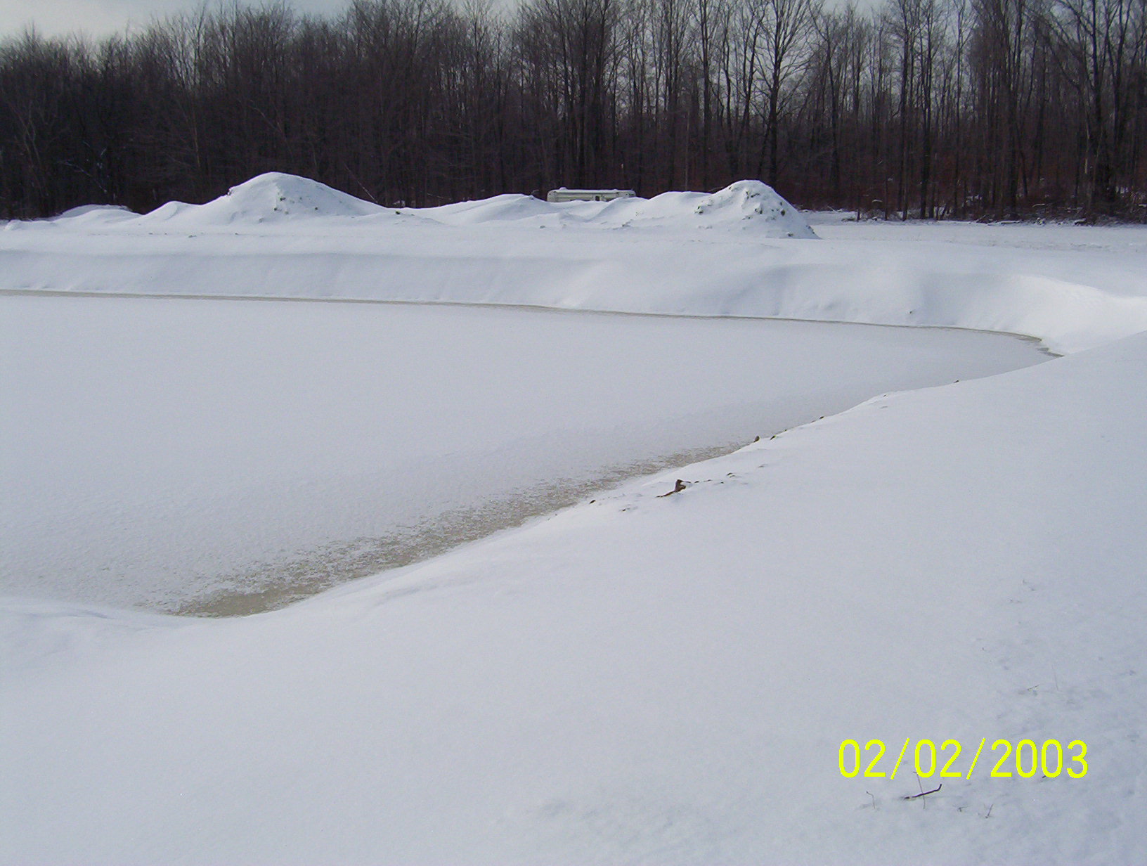 I started this pond thread back in the summer,, and didn't really find the time to keep up with the progress/pictures the way I wanted to. So, I thought I'd post a few photos to show just how fast the pond has filled. It was dug in late August '07,, and started filling almost immediately. The earlier pics shown here are from right around the Holidays '07,, and the snow covered ones are within the last month or so. As of today,,, water is flowing freely and continiously from the overflow pipe,, which can be seen in the last photo!!! Will try to get new pics of that soon. So, in a "nut shell",,,,,,,,,,,,she's full !!! This summer I plan to work the clay dirt/ topsoil piles to start dressing up the site. Also, disregard the date in the pictures.