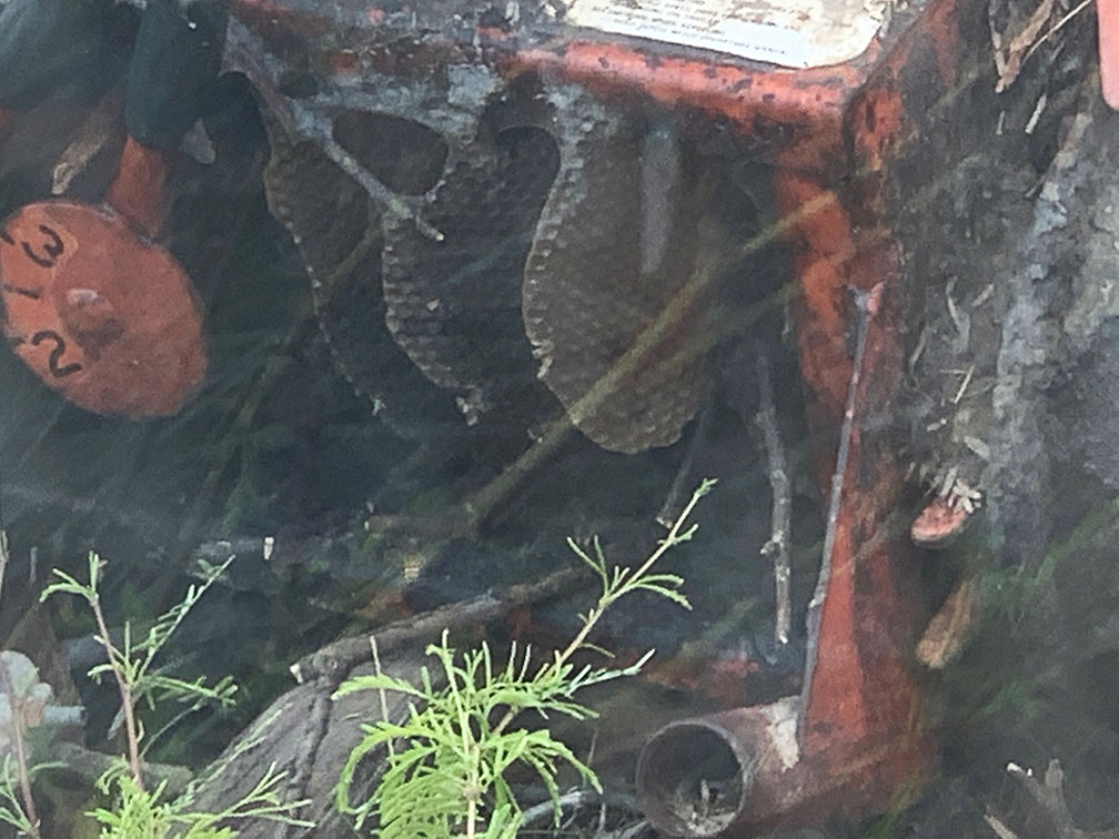 Finally got around to taking a picture of their "hive" embedded in the old trencher. One picture shows a bee flying around and as I watched they were bees. Not as angry this time as I creeped up and never disturbed the hive and watched from a distance inside the cab of the tractor.
