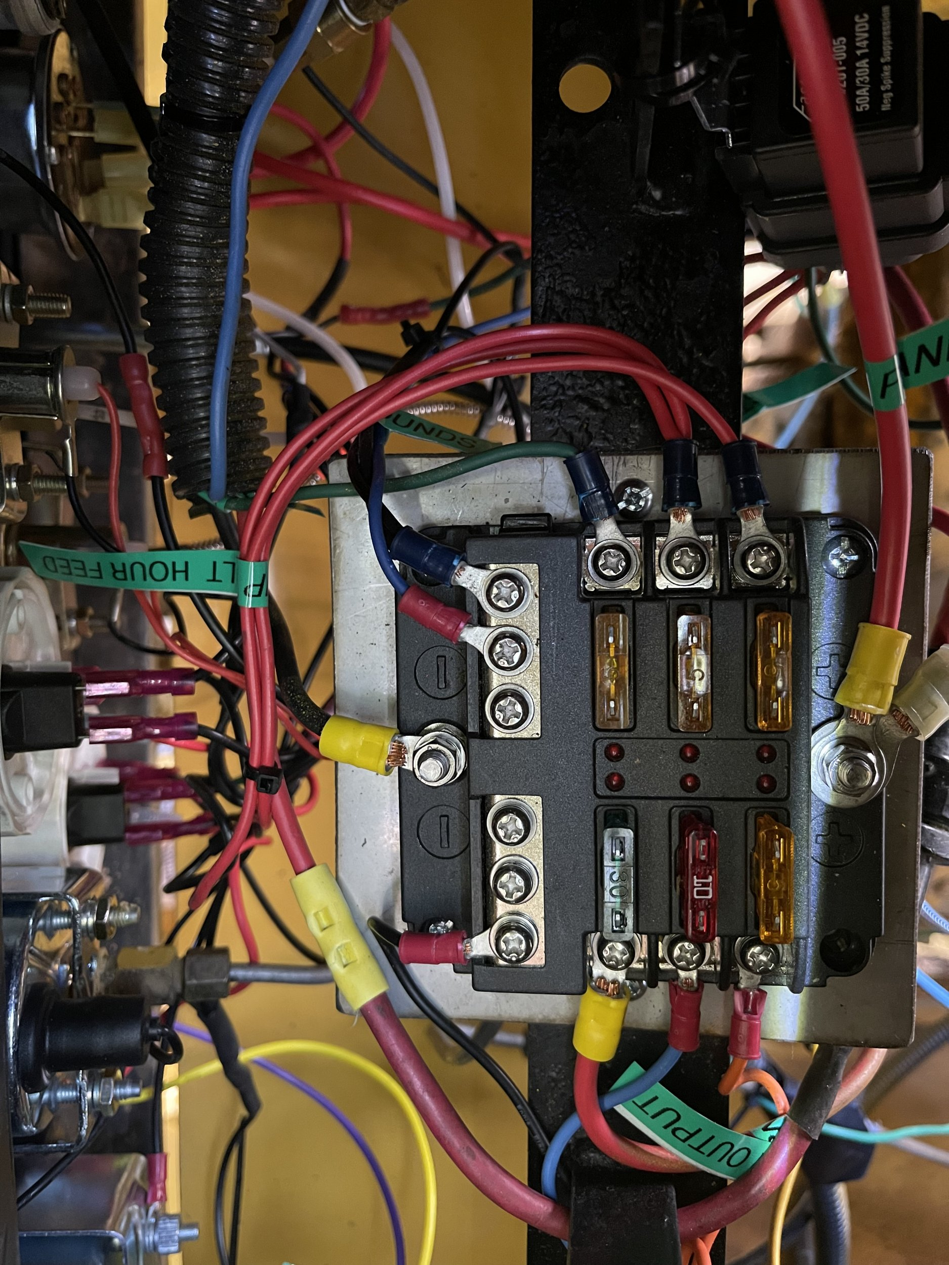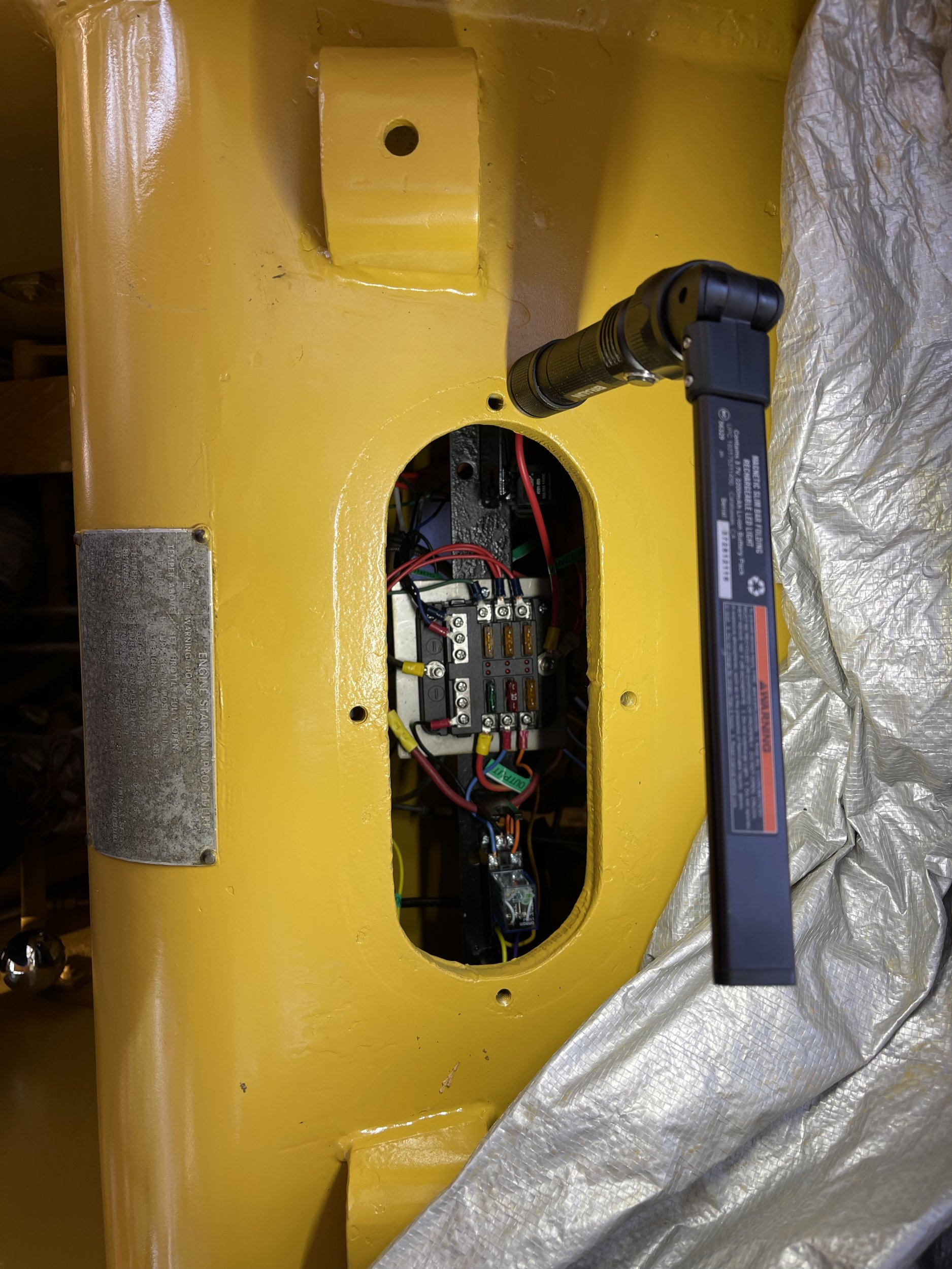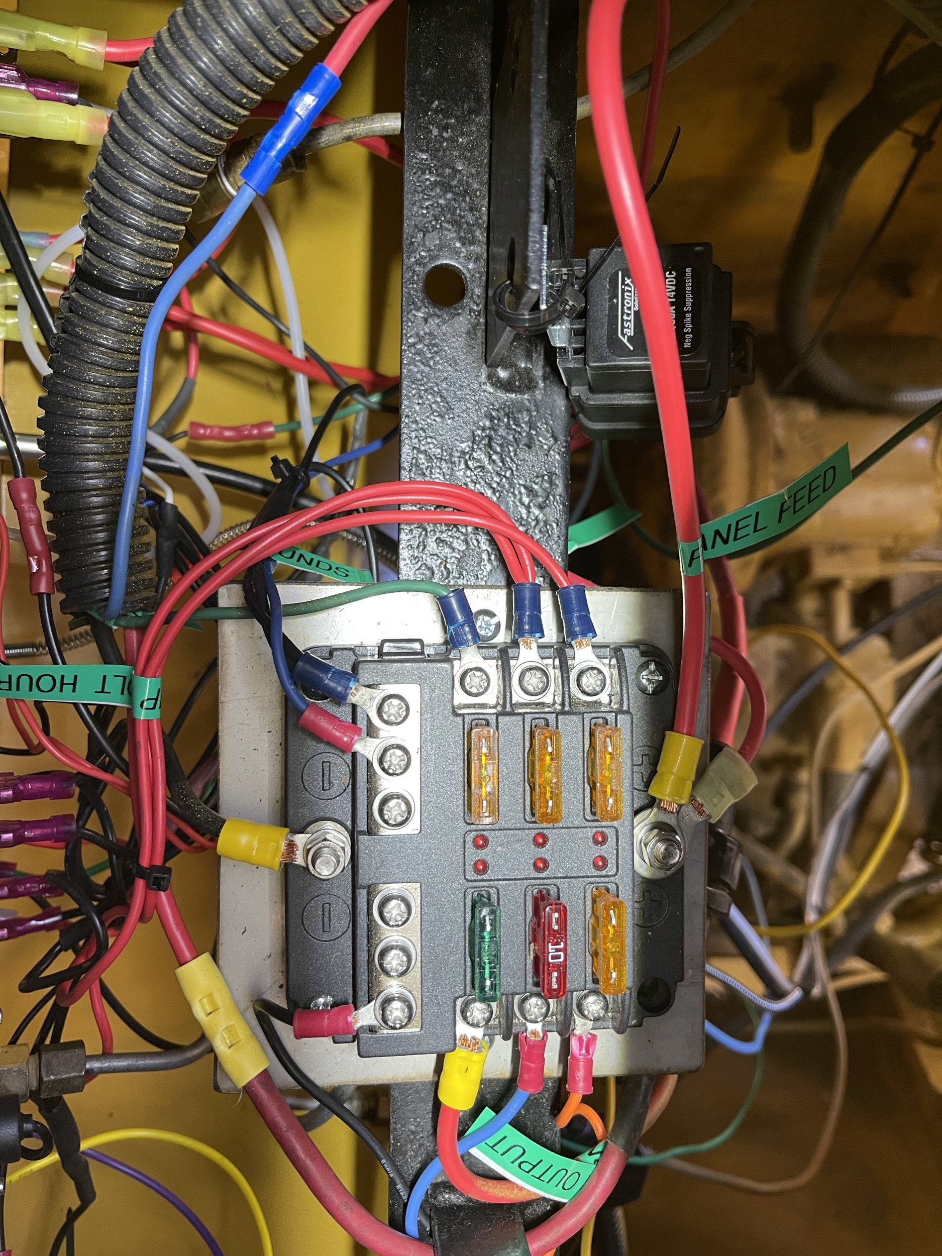 Ok for a small up date. This is dashboard and battery install. Also fuse holder. This machine has a bracket that is sandwiched between the dash and the frame to hold the fuse holder. It protrudes about 6” to the front so it lines up with an access opening. It is like some car things where they had an advantage we don’t have in the field. Trying to hold it up while putting in the dash and while tucking wires and pressure tubes just didn’t seem like a good plan. That explains one of the pictures with a small screw that I drilled and tapped to hold it up.