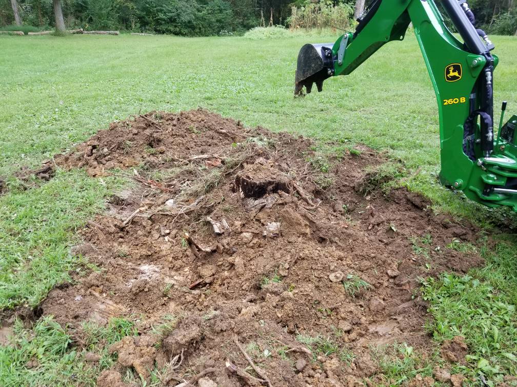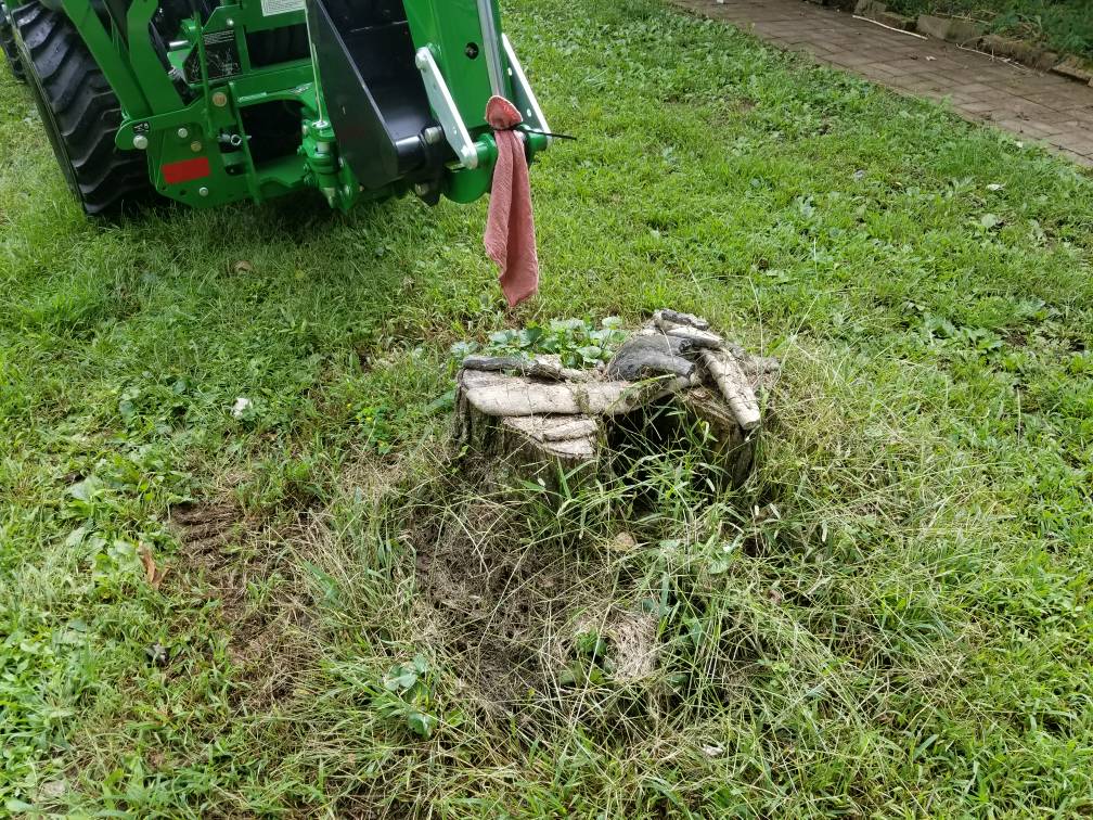 1025R arrived on Saturday sans tiller, grapple and third function hydraulics. Almost immediately set to work on removing a large stump in front of the house.