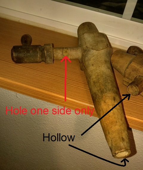 So, like I said it's at my mother house and my sister said there were no holes, but now she's not so sure, so I suspect you are all right that it's a whopper spigot for a barrel of something. If she can find it again (packing up to sell the house) she will send me a photo of the other end, and then we'll know for sure. Thanks for the replies.