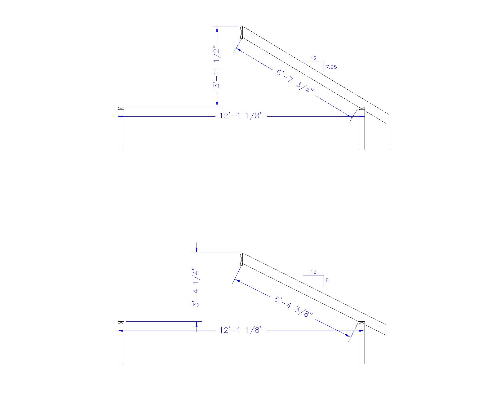 I'm pretty good at figuring things out, but something's got me confounded on my well pump house I'm building. The seat cut or birdsmouth on my common rafters- I've figured out that my total rafter length is 7'2 3/4" (building is exactly 12' 1 1/8" wide outside to outside). I know I need to subtract half the thickness of my ridge board from that, which gives me 7'2" to the outside of my wall, and where the seat cut begins. I will run the boards wild another 15 inches to allow for overhang, and cut them back later. The problem I am having is figuring the depth of the seat cut. I can do it the full 3 1/2" width of the top plate, but it seems that the deeper the cut, the more my rafter wants to drop from flush with the top of the ridge, or if I keep them flush with a full cut then the pitch is thrown off and I have a gap between the bottom of the rafter plumb cut and the bottom of the ridge beam. I am trying to keep the board flush with the ridge so that my sheathing can run to the top. If the ridge is sticking above the rafter, my sheathing cannot run all the way up. What am I missing here? It's a 6/12 pitch (actually a hair less because the ridge is sitting at 47 1/2" instead of 48" above my top plate (I cut the jacks it is sitting on short and didn't want to have to take the whole thing apart after noticing it)). Do small gaps not matter? I like things to be very tight.