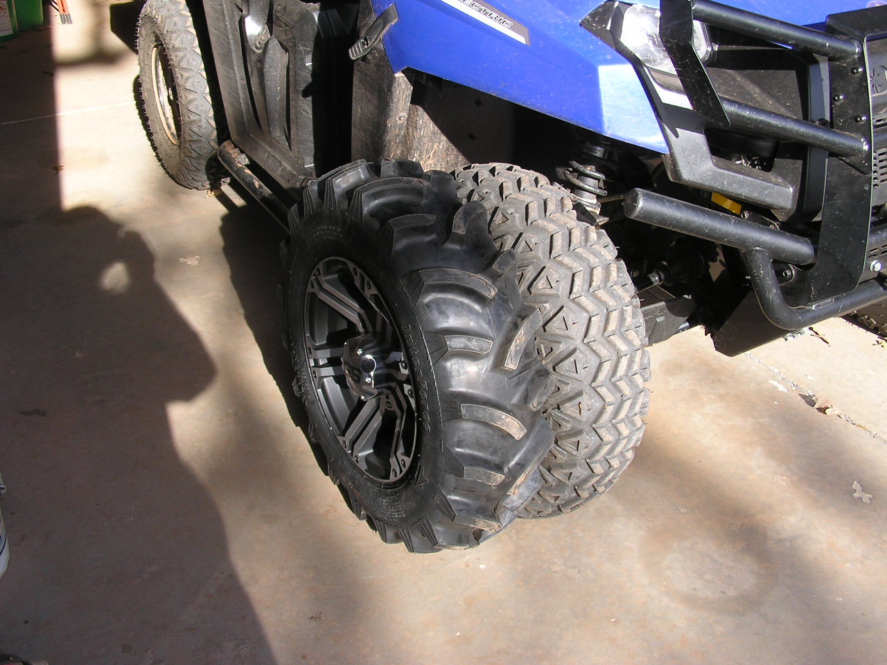 And NO the tires are the same size, rim size and tire width don't matter for what we are trying to explain here. My tires are 25" diameter on both ends of my Polaris 500 HO Sportsman and that measure out to 78.54" around. Each revolution the ATV will move that far ahead.