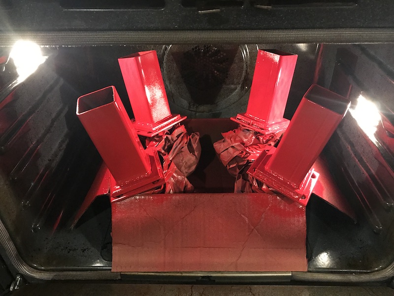 Ha ha... that's what I did. Here is a picture of four 'boots' with swivel casters I made for a steel table that I rescued and restored. They did fit in my wife's oven and she did wonder what the smell was when she came home. I had to confess.