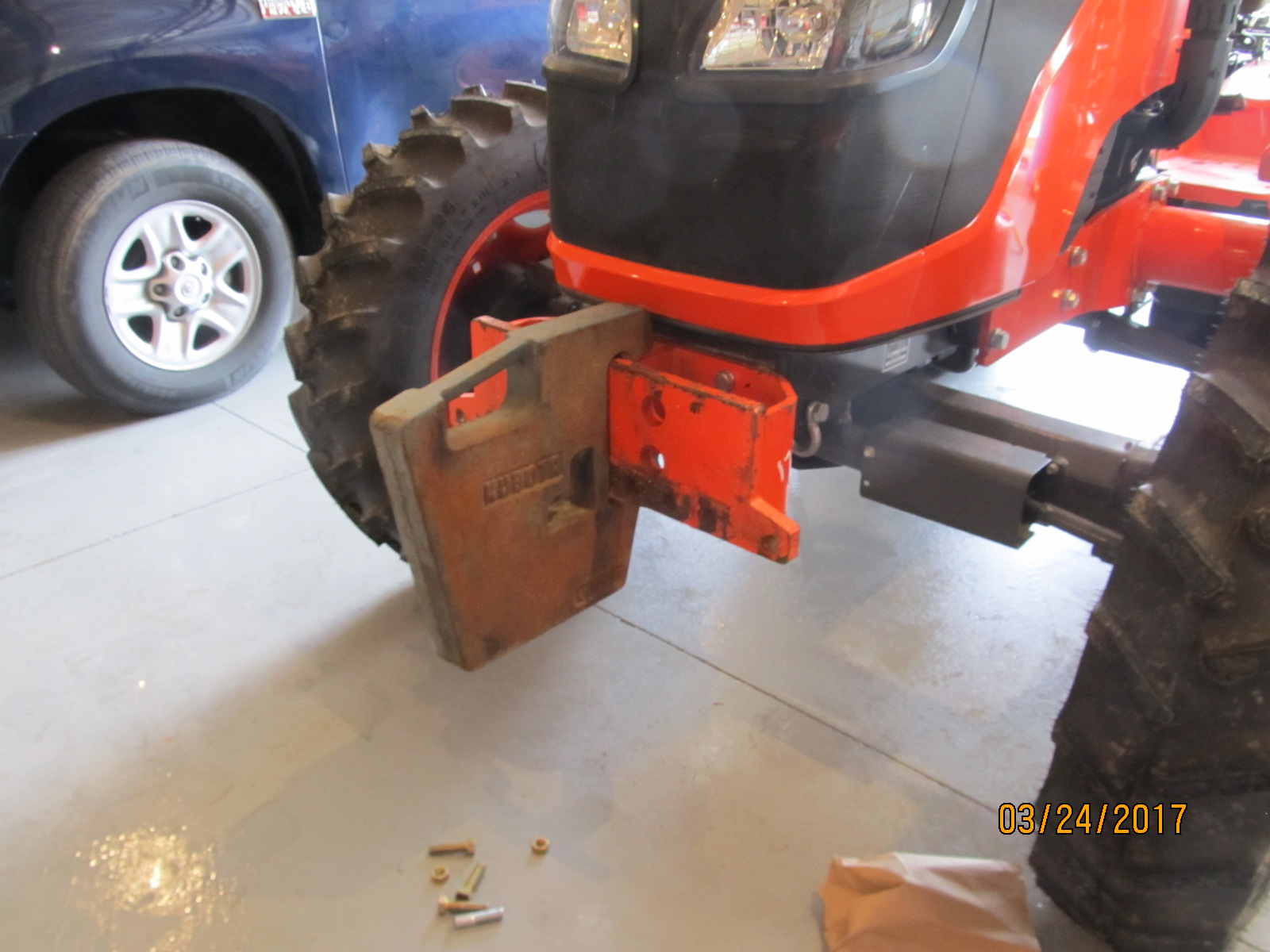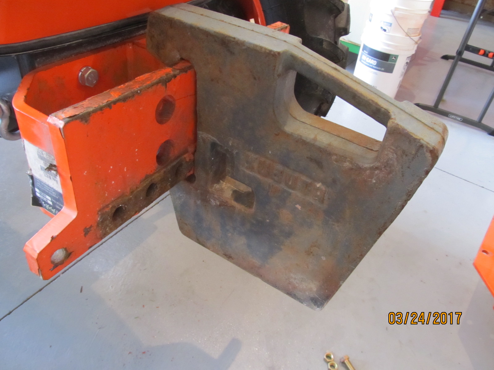 I bought them used for a good price along with the bracket. The bracket is for an M5460 or something like that but through judicious cross-searching I learned it would fit my M7040 as well about 30 other Kubotas. I wonder if Kubota doesn't like to fool with part numbers and applications. Anyway, it fits so I bought the bracket and 7 weights for a total, I think, of 800 lbs. I'm good with that.