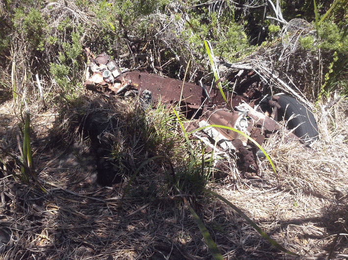 In the vegetation covered sand dune behind our beach shack we found the remains of an old car. The body is totally rusted away and I can find nothing left that provides a make or model. But the grille, being some kind of heavy cast alloy has survived reasonably well. And the engine has a distinctive inclined water jacket along the top.