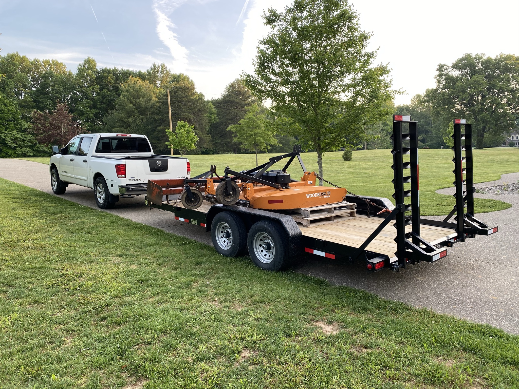 Broke the new trailer in on Saturday. Picked up my 8' rotary cutter from the shop (One year old- trashed gear box replaced under warranty) and took my 7' box blade back to the farm. I had the shop load the cutter, and I loaded the box blade at home. Should have had the cutter a little more to the rear of the trailer, as I had more tongue weight than I would have liked, but the trailer tracks well. 90 miles one-way. Empty weight of this trailer is just over 2,000#, so that leaves me 8,000# for payload. Truck towing capacity is 9,400#. Should be a perfect match for what I haul with this trailer and truck.