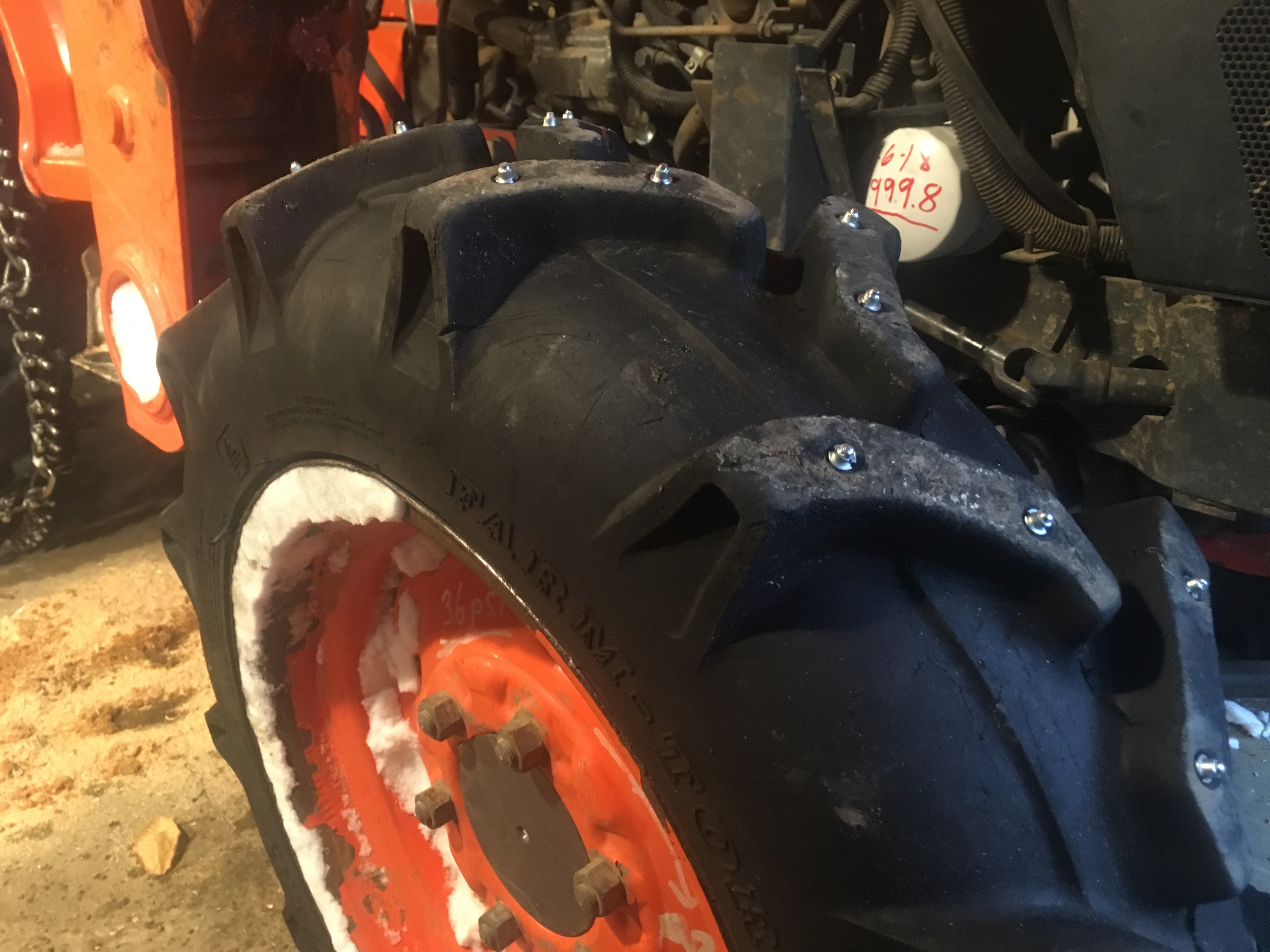 I use grip studs in my tractor for winter. they work very well. I have chains but since I went to a cab tractor I help out my neighbors some and the chains will drive you nuts if you run down the road at all. the studs are smooth when plowing and grip very well. I have a sloped driveway thats partially in the shade and the studs are great. I looked at several different kinds of studs and went with the grip studs since they wont break off in your tire.. they are used on things like skidsteers all the way to trucks. there are alot of different sizes on the website with charts depending on your tread depth. overall i'm very happy with the grip when plowing. I have a 7.5' power angle skid steer mount plow that I used last winter with the grip studs on a boomer 3040. it kept the front end from sliding when pushing snow with blade angled and I had no problems on glare ice with them. I will be installing the grip studs this week in the new LS XR4145 .