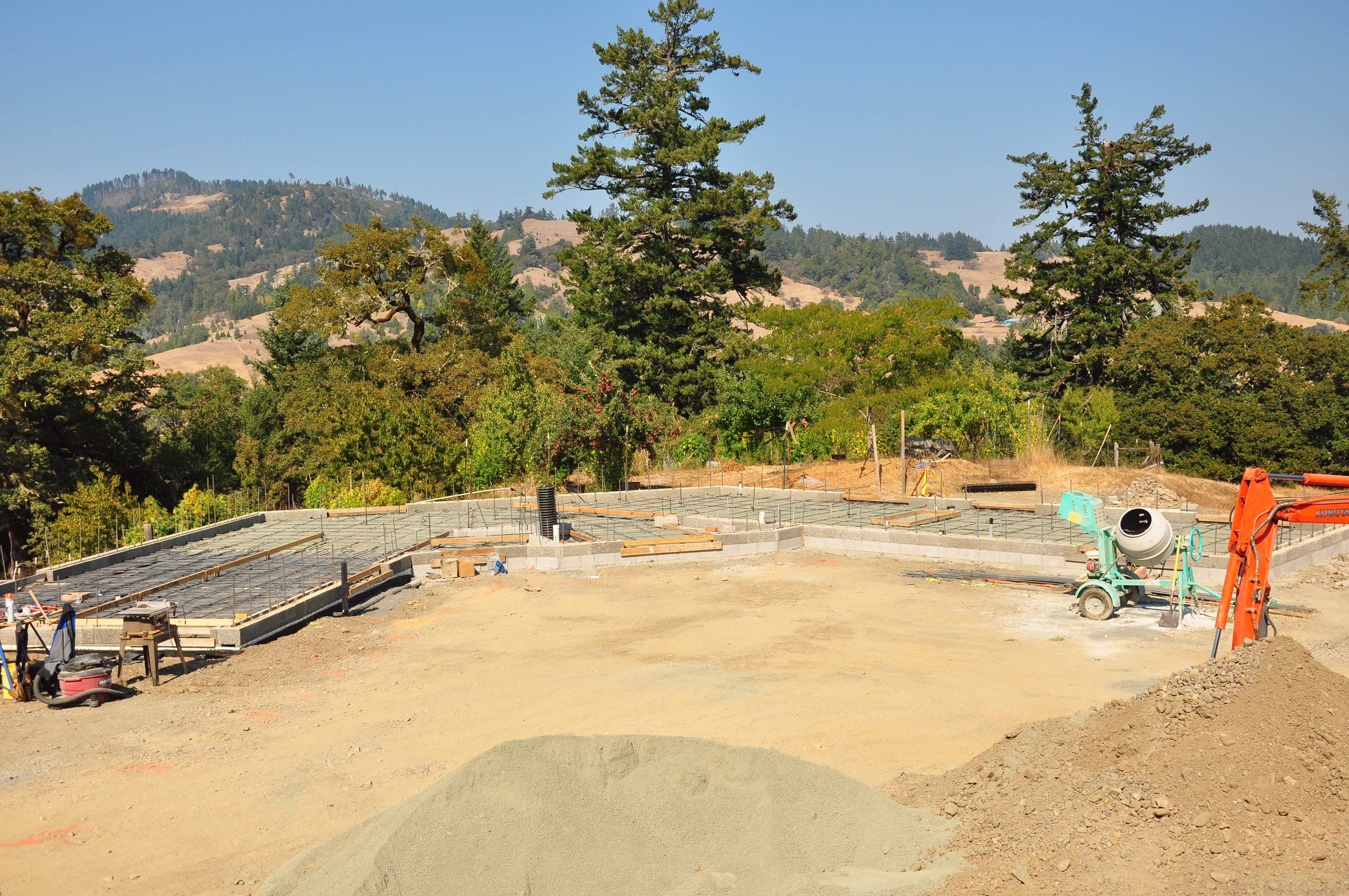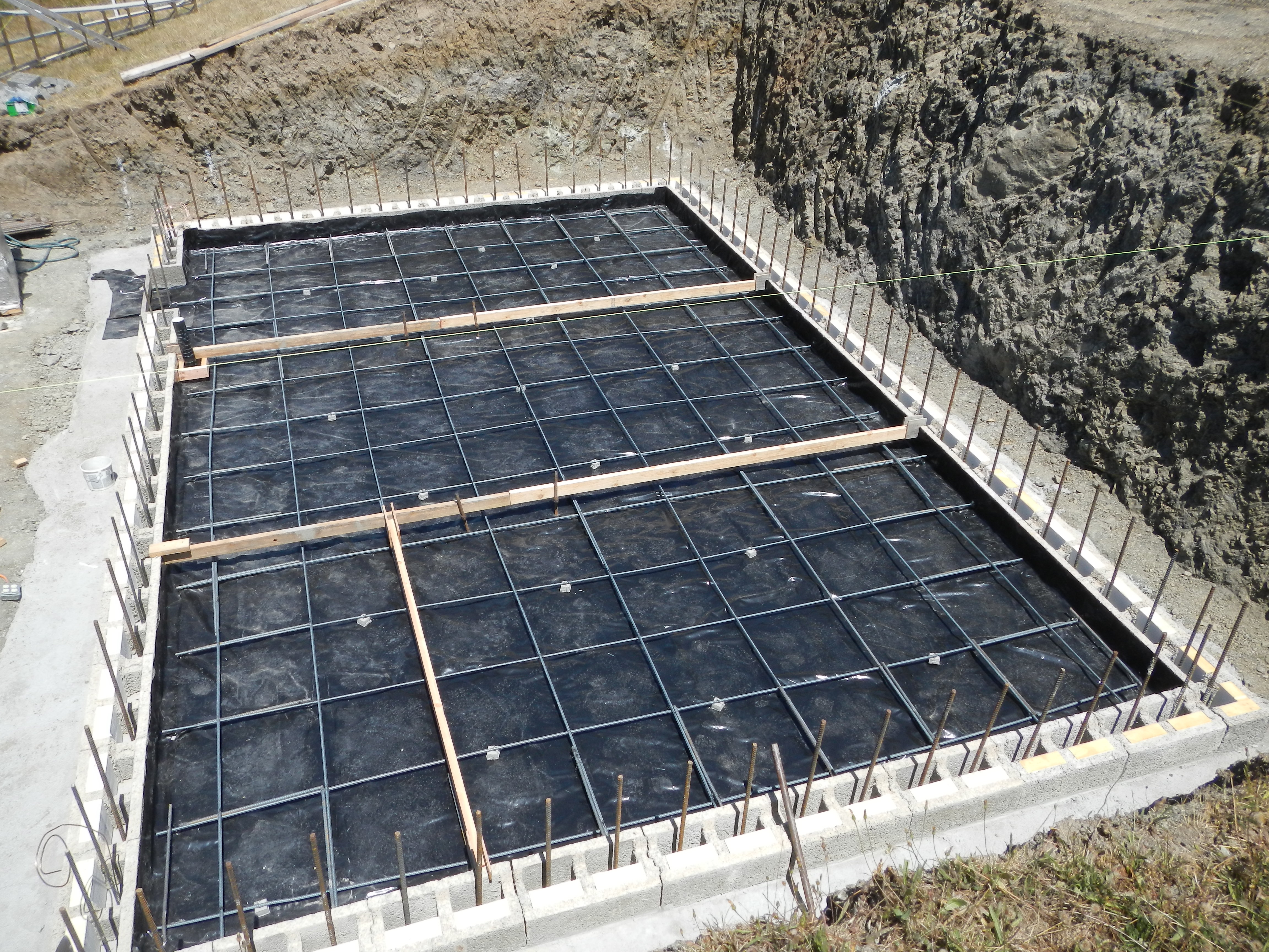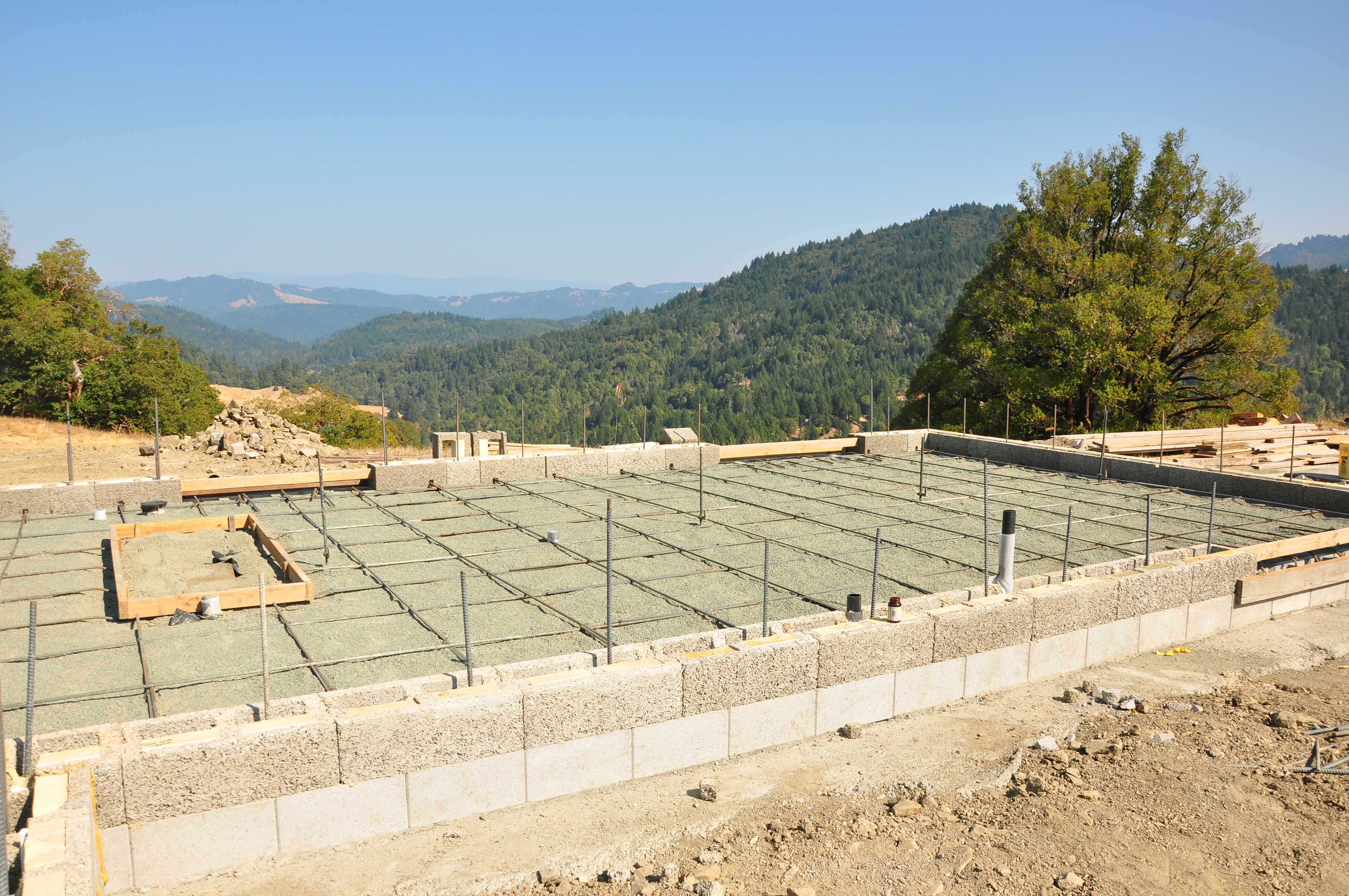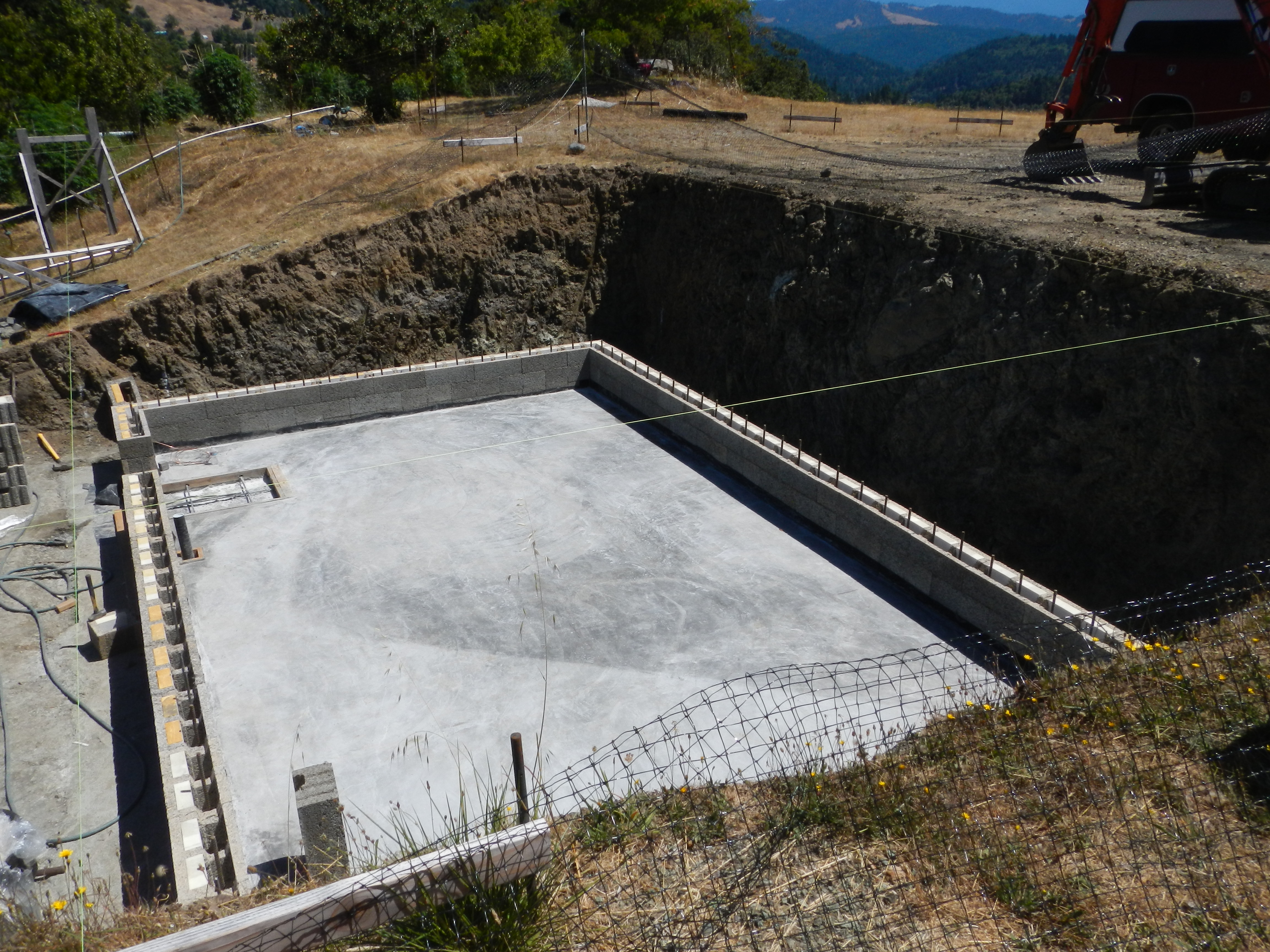 This shows the first course of the basement walls sitting on the footer, then ready to pour the slab with the blocks as forms, and then the slab with two courses up. We're in N. Calif. and the climate is pretty mild so we didn't do any radiant heating in the floors.