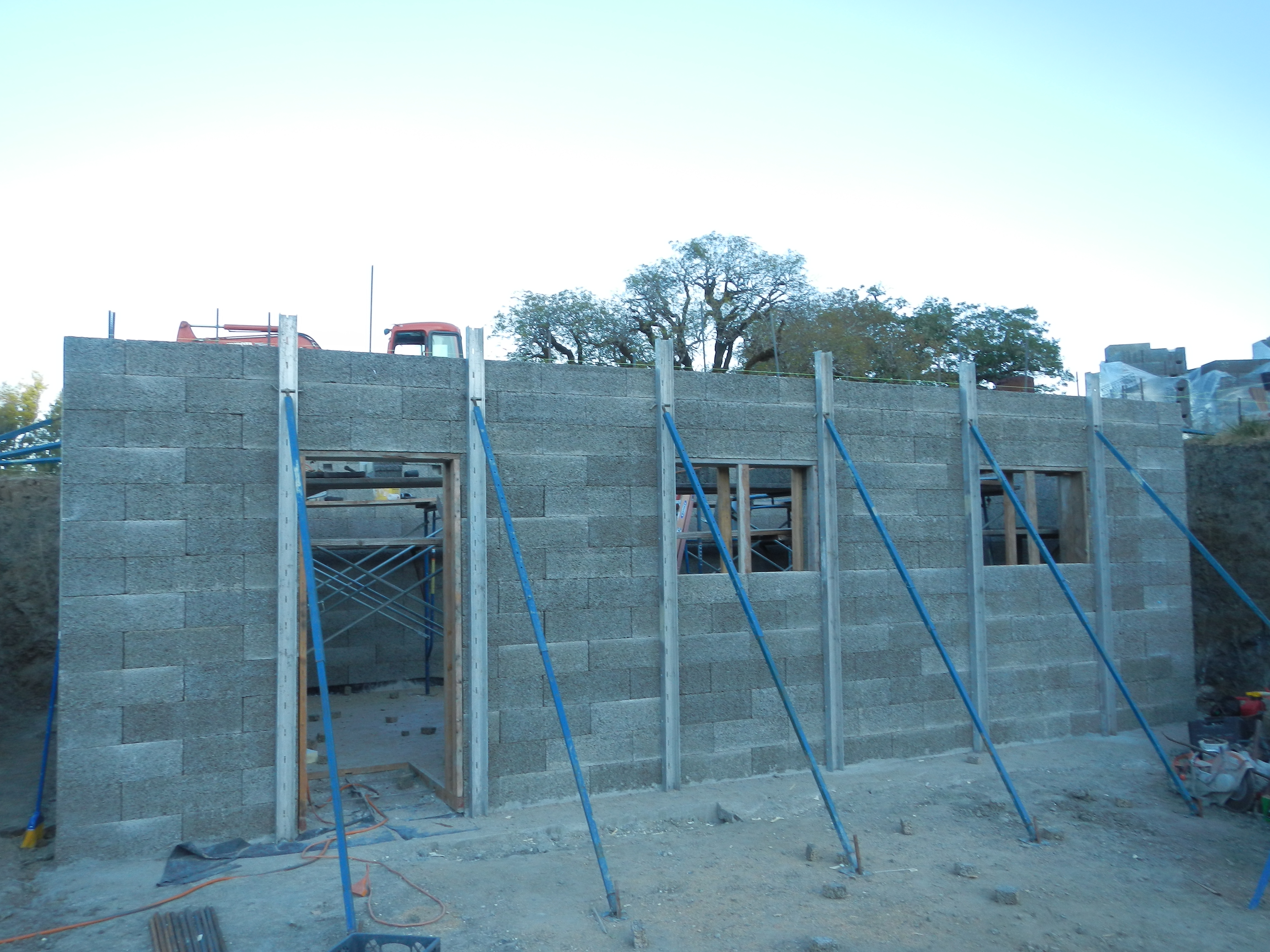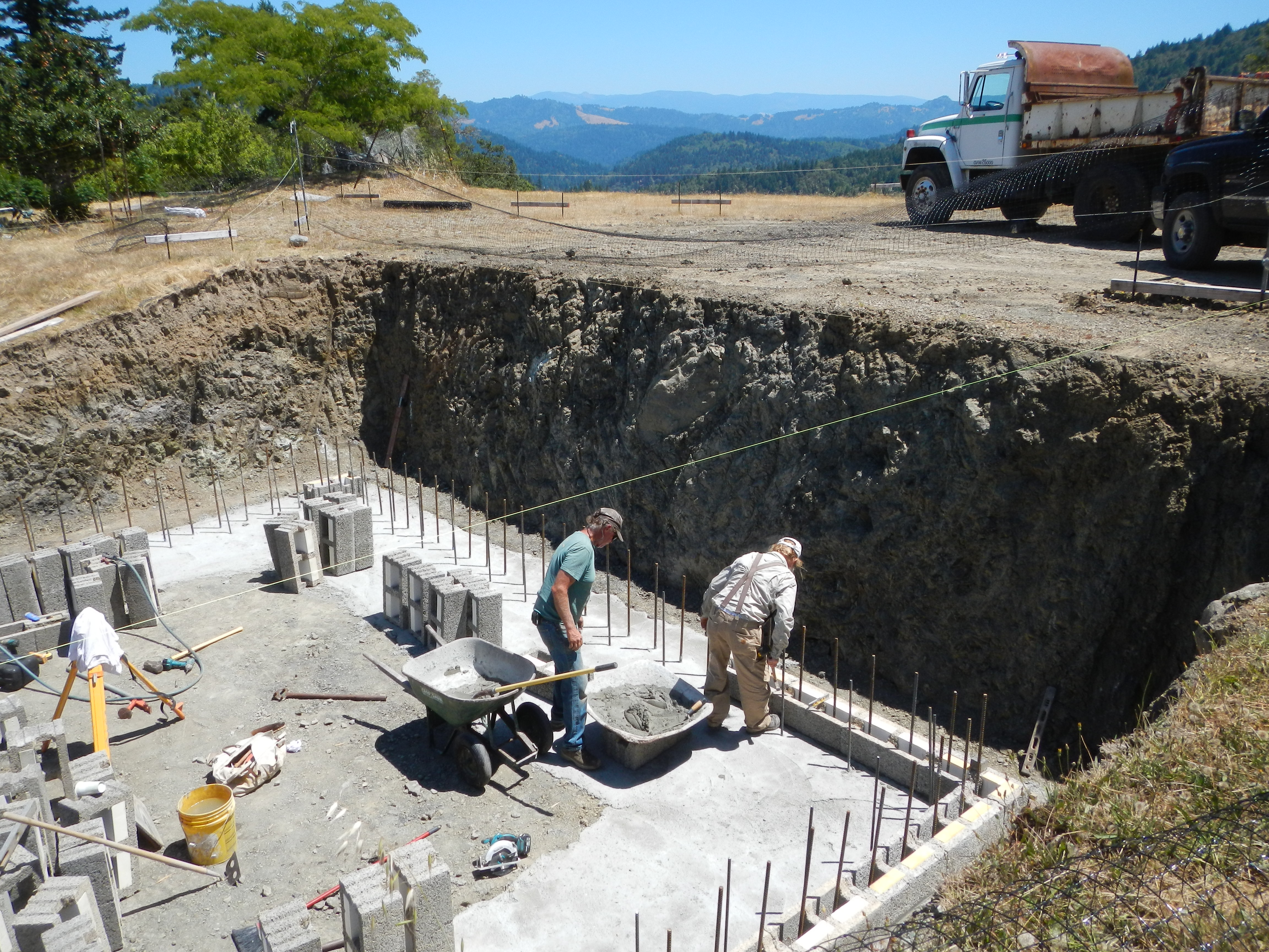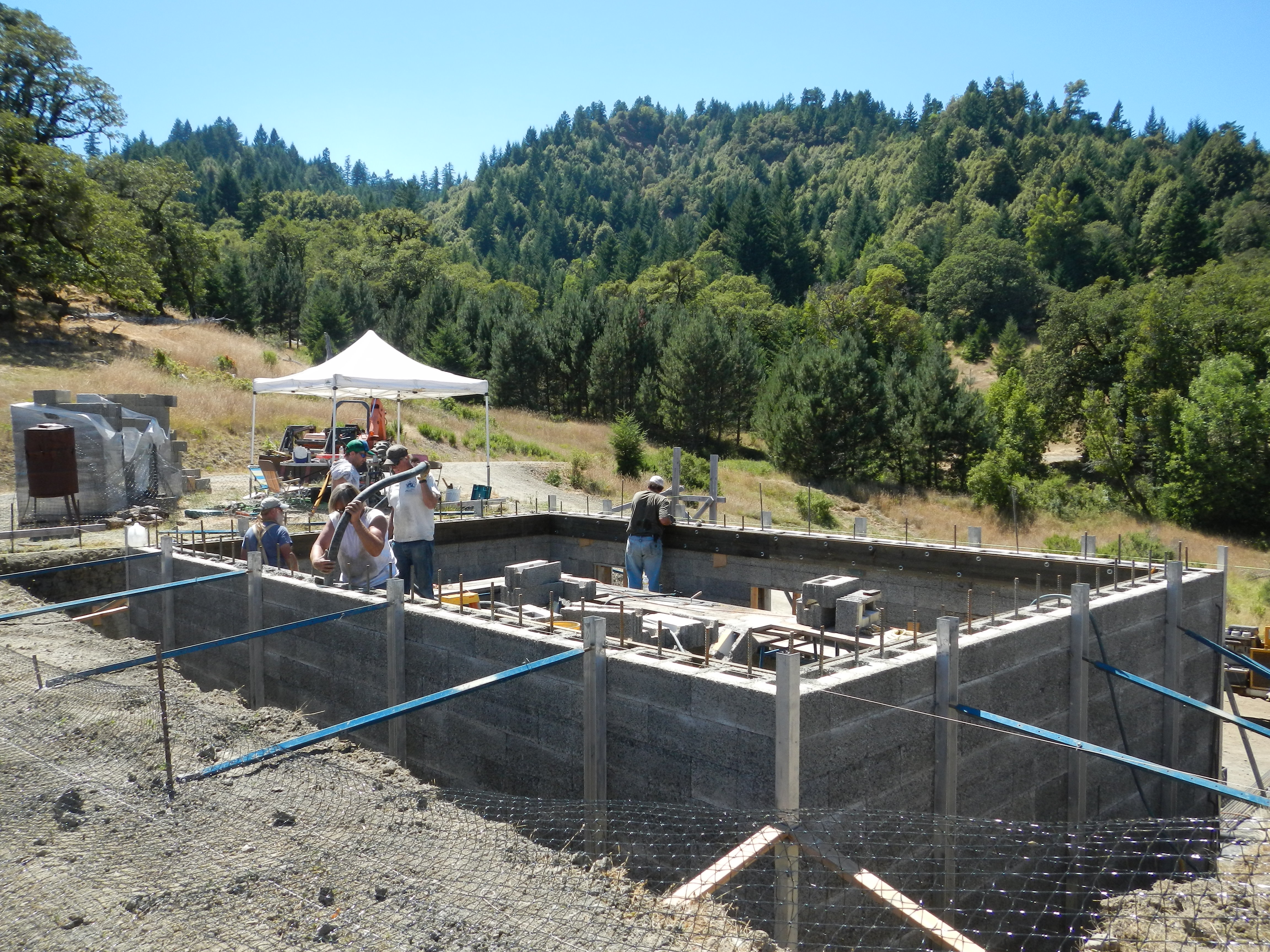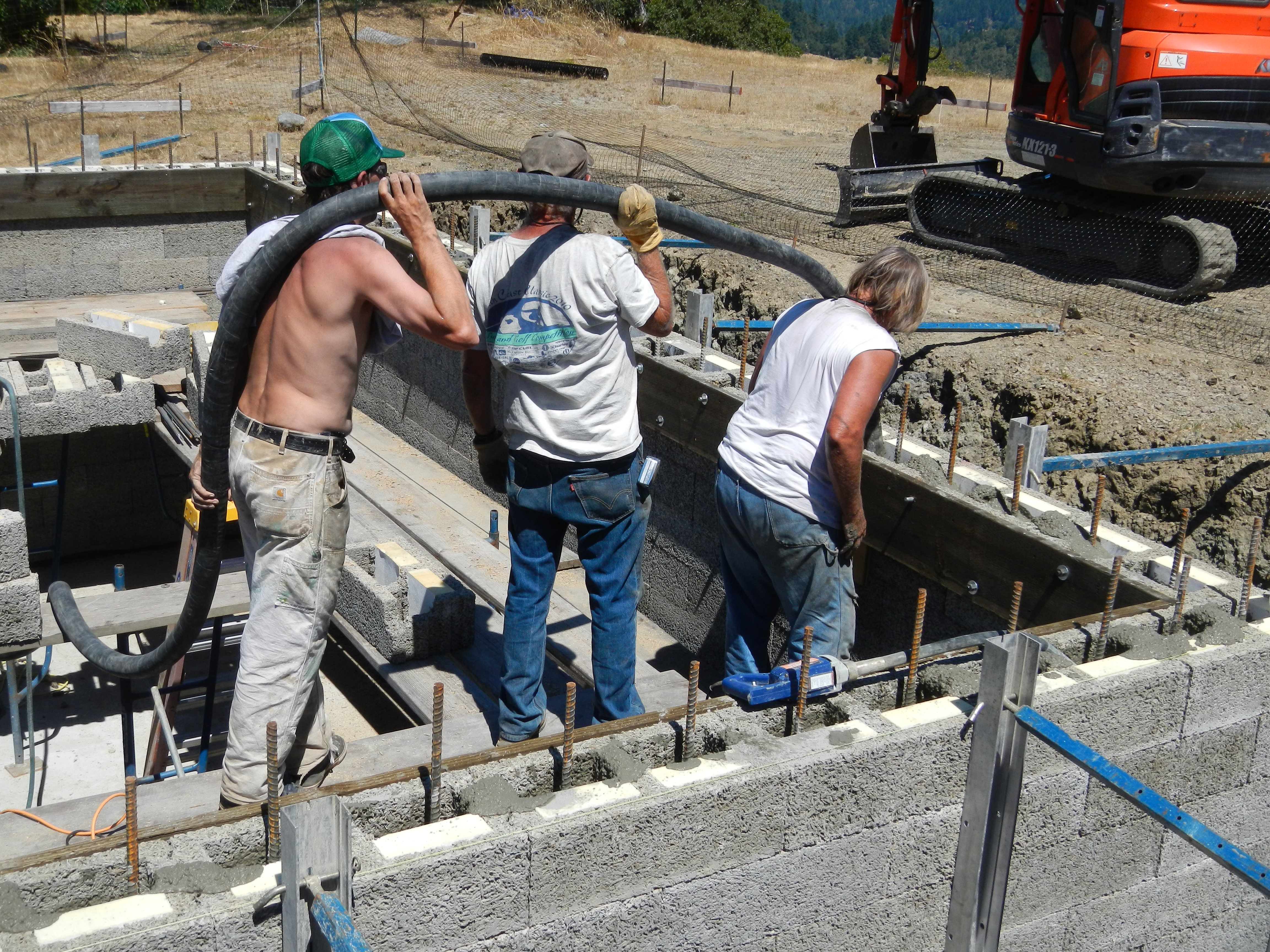 First photo is basement block stacked, braced, and ready for concrete. Then going around and around filling walls. Having scaffolding inside for stacking higher courses of block and then pouring concrete is crucial. These walls took 11yds.