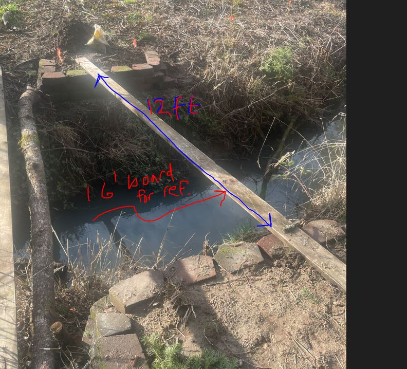 I have been toying working with a windfall fir tree that I cut in half for the beams. These are shown with dimensions in the images below. I have a bunch of 2X6 boards that were lying around for the decking. I also have PT 6"x8" "posts" that I could use for center supports, but not sure how well those posts will set in the creek (I could set them in concrete in the summer time when it is dry, but not sure how they hold up under constant water). What are your thoughts? The beams would be about 3'-4' apart with the 2x6 cut into 4' lengths going cross wise the entire distance.