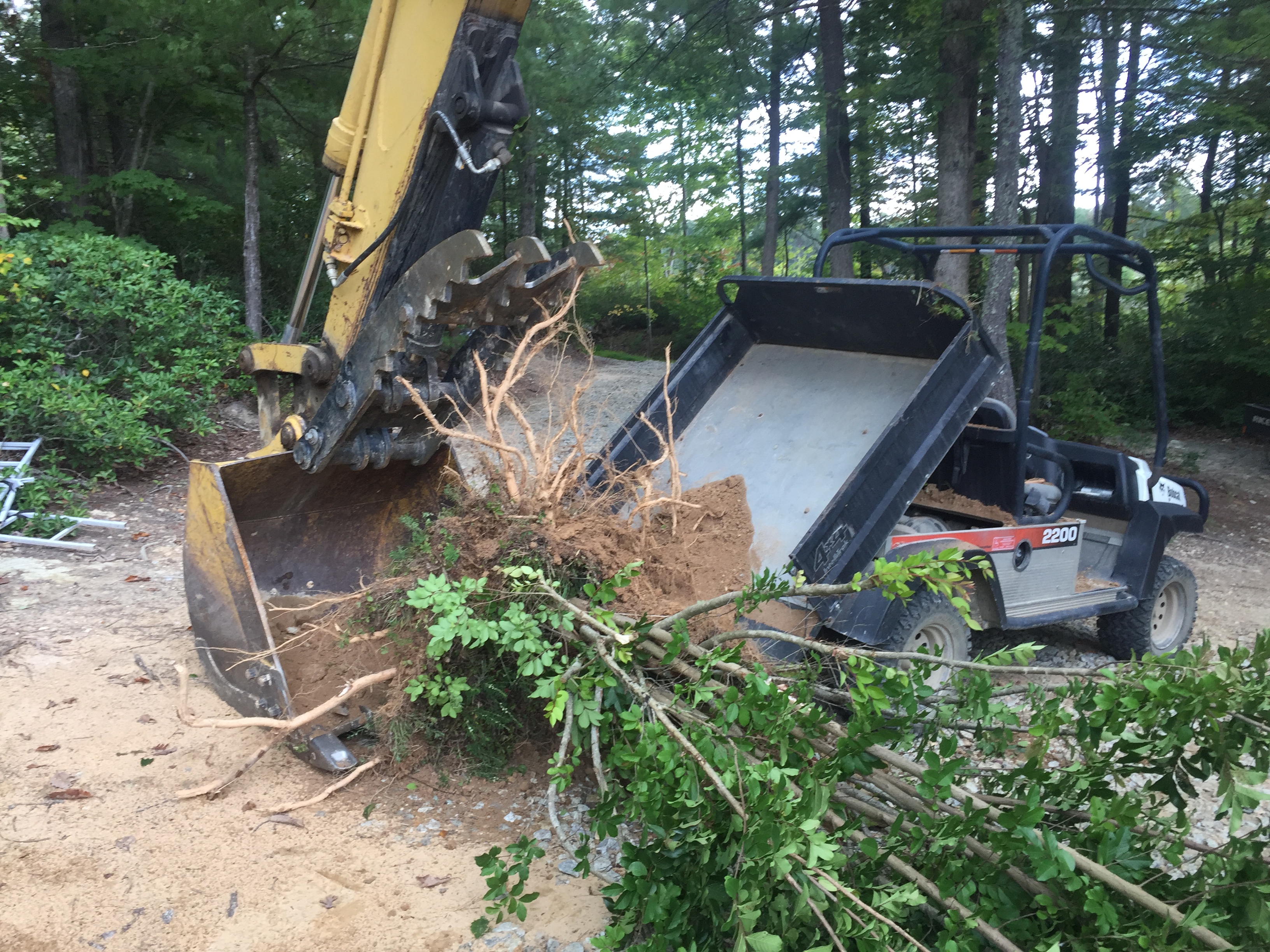 Moving a Crepe Myrtle from the dam. Not the best time to dug up and relocate a tree but it had to be done now. There were three of them to move and I thought it would be better to put the first one in the bed of the Bobcat and dig up another and carry that with the excavator. Didn't work out the ways I planned. First I tried to delicately pour the tree into back of the bobcat....I had branches blocking me and couldn't see. ended up rolling a rock out and across the seats. The tree was leaning over the side onto the ground so I dumped it out, trying to get it to land in the bucket...another fail.