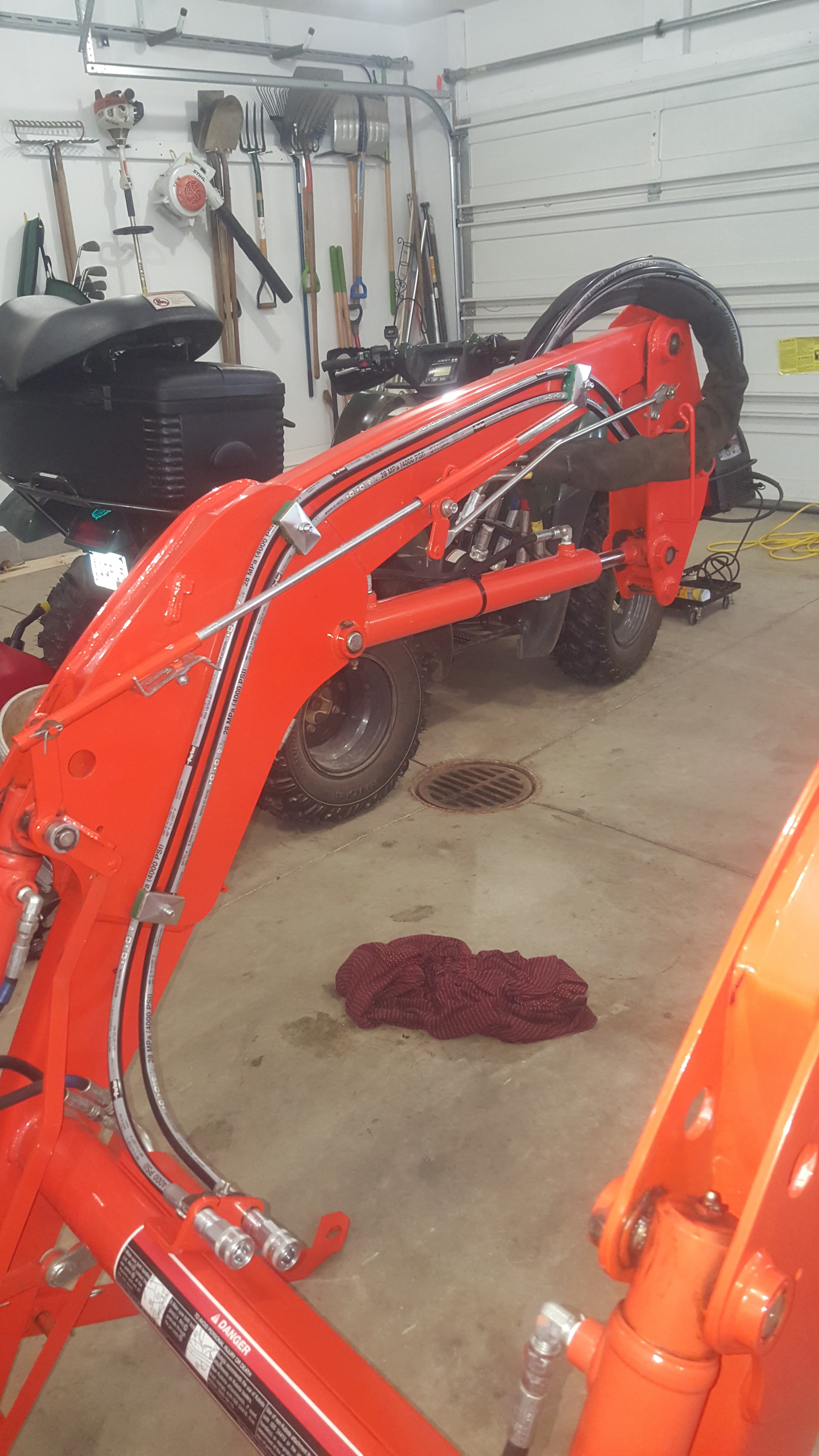 After I got everything hooked up and air bled out, everything works great and no leaks. The top cylinder will cycle my 700lb ballast box just off of idle no problem. Just have to run the front set of hoses up along the loader arm to the front bracket by the front bucket, probably next week. Then the project will be done. Will post the final pics.