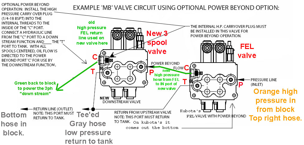 Then the power beyond plug is installed and the line feeds to the 3 pt hitch. Then the tank line is tied into the existing loader drain line.