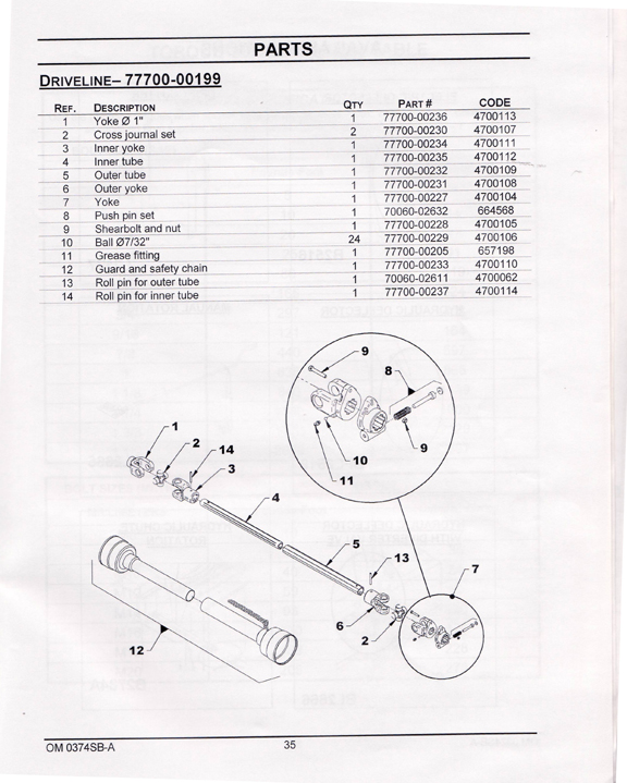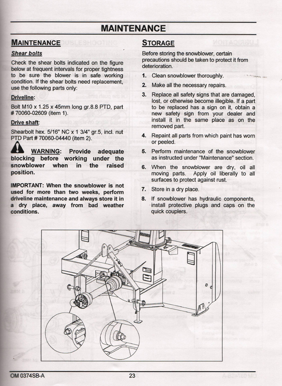The manual for this blower lists one size of shear bolt and its part # for the drive line on on page 23. On page 35 in another exploded view, the same part lists another size of shear bolt and a different part #.