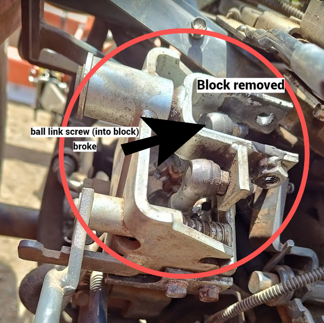 Big ask -- hoping someone can tell me how to actually replace a failed part. PIA in terms of space and access. The ball link (part of loader lever control assembly) that controls my loader curl failed. The screw that goes into the loader lever block sheared off; I've removed the block and have a new one on order (as well as a new ball link). Am thinking the only way to actually replace the ball link is to remove the metal bracket around the whole assembly. I included a photo showing where the blocki is located (I removed the broken one already); The ball link is shown. It attaches down in the assembly to a rod that feeds into a valve assembly. Any help would be greatly appreciated. thanks - josh
