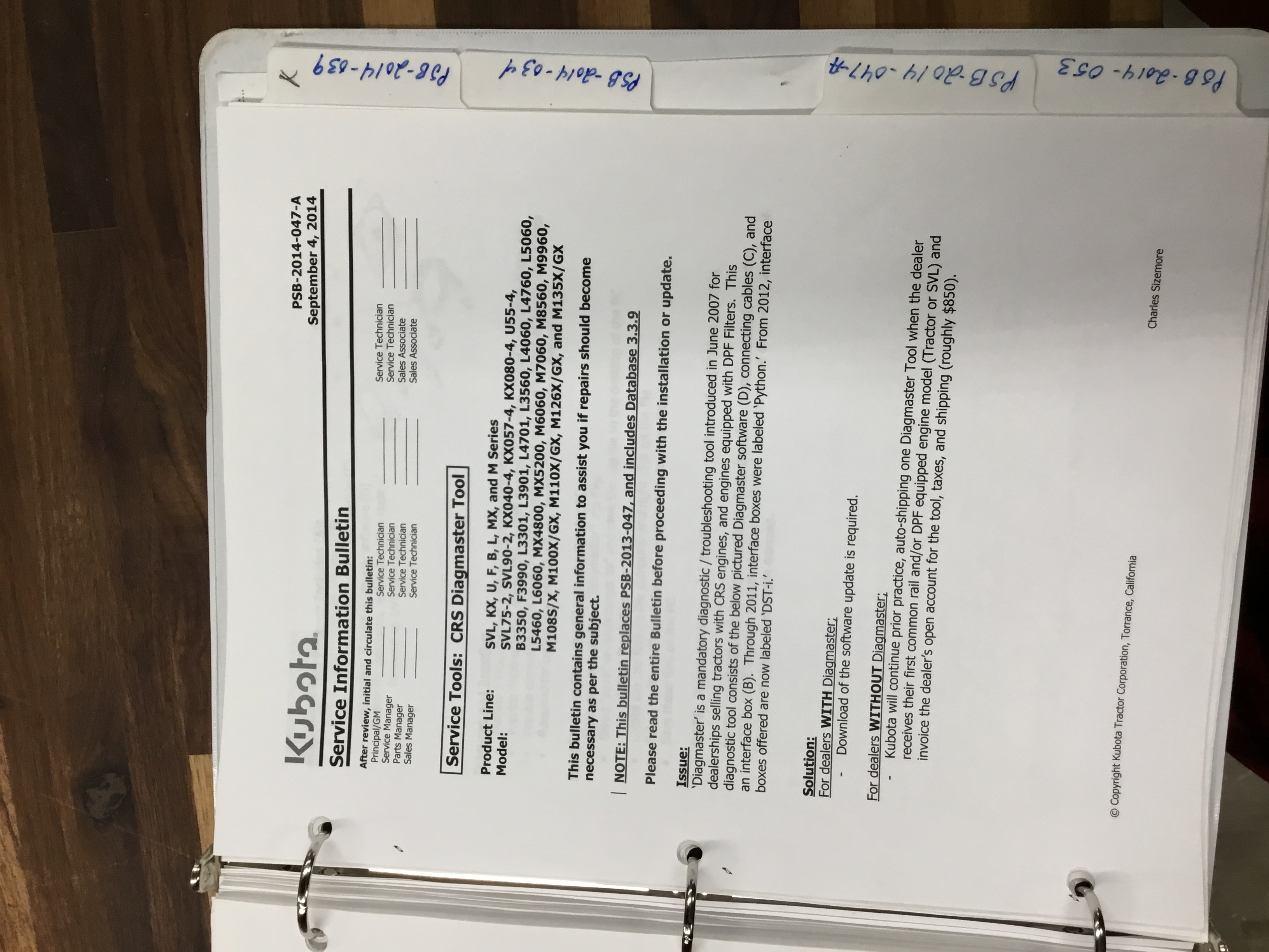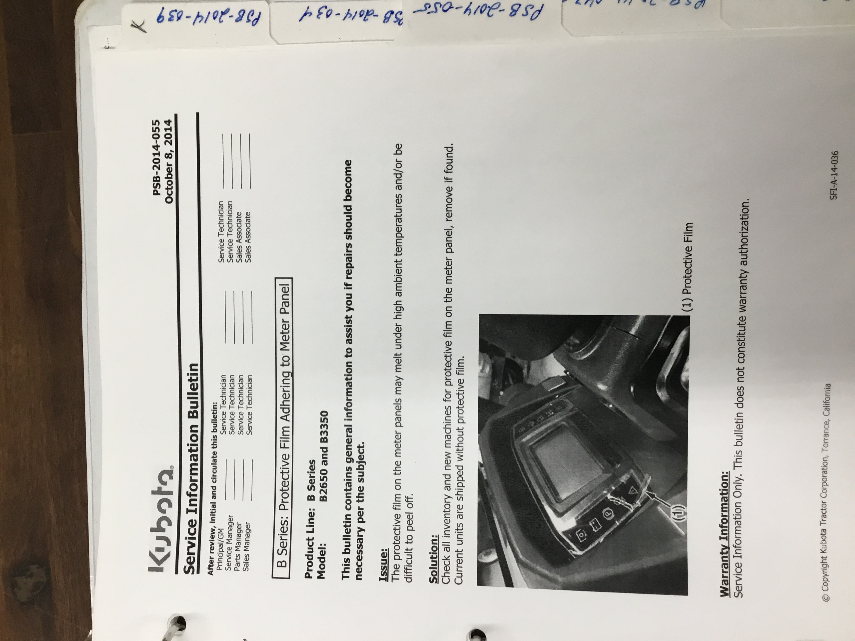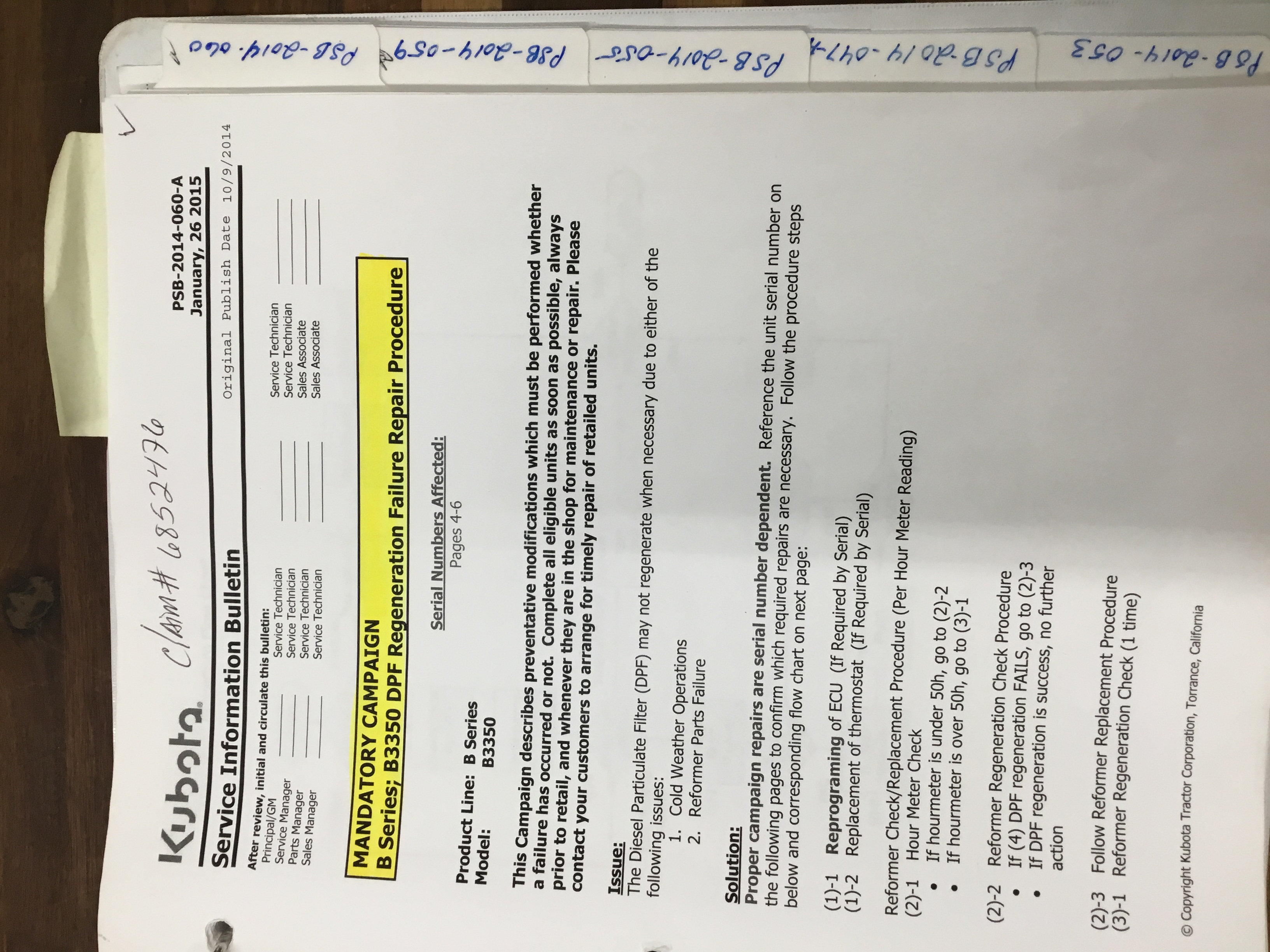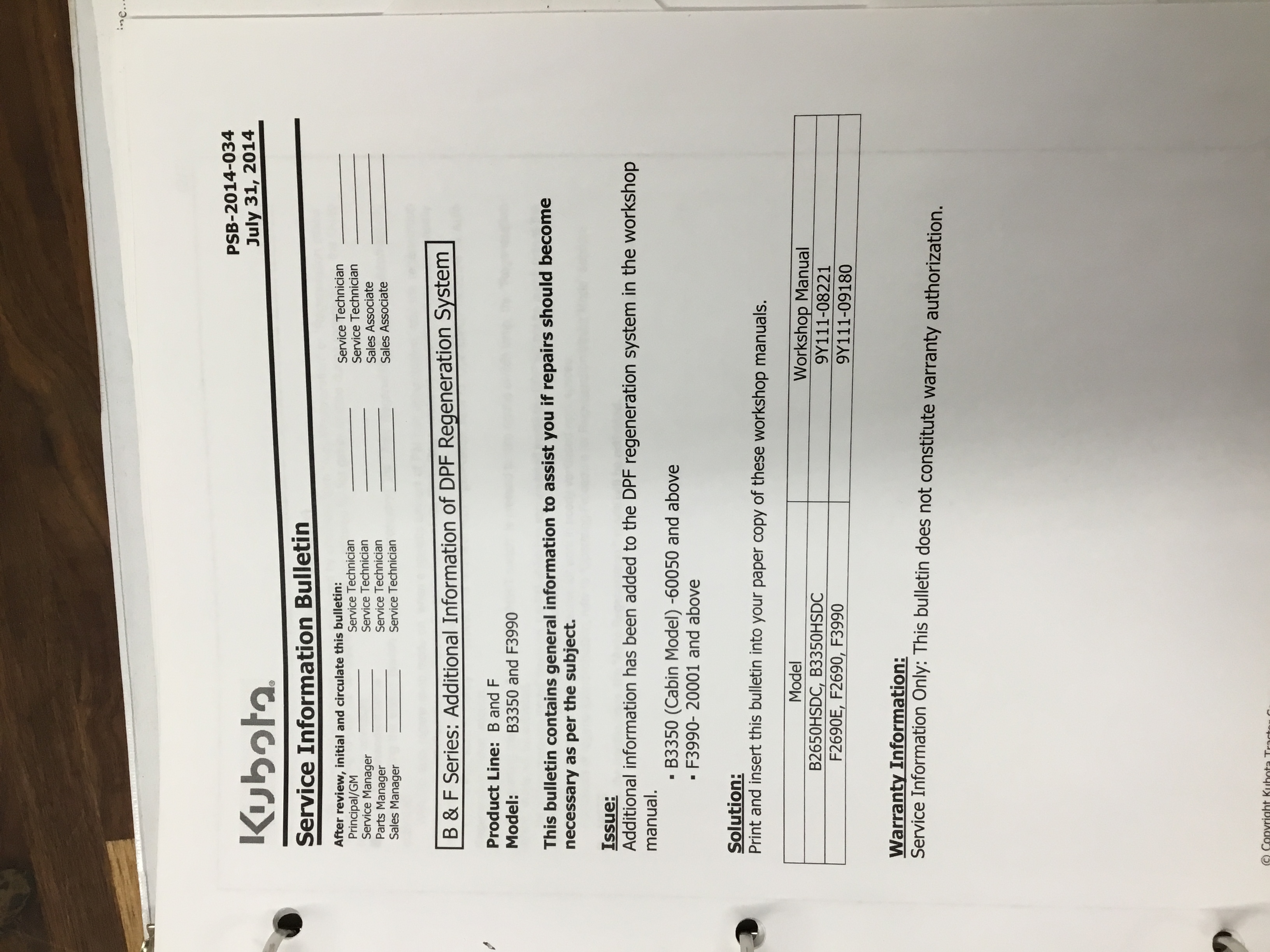 Randy, my B3350 died in the middle of a icy road. I had to tow it back. That was my first exposure to regen. 3 times back to dealer for revisions. They have a 2 inch 3 ring binder on my tractor. Mine died once last fall when I was just towing a chipper and went to move to another location. I had to wait like an hour and then the key would let it turn over ( computer crap). I have an early b3350 and recommend you push your dealer into learning more about them. I could photo the pages of my " book" at the dealer ( I think , they'd let me ) and email to you. PM me if interested. Maybe they would help your dealer?
