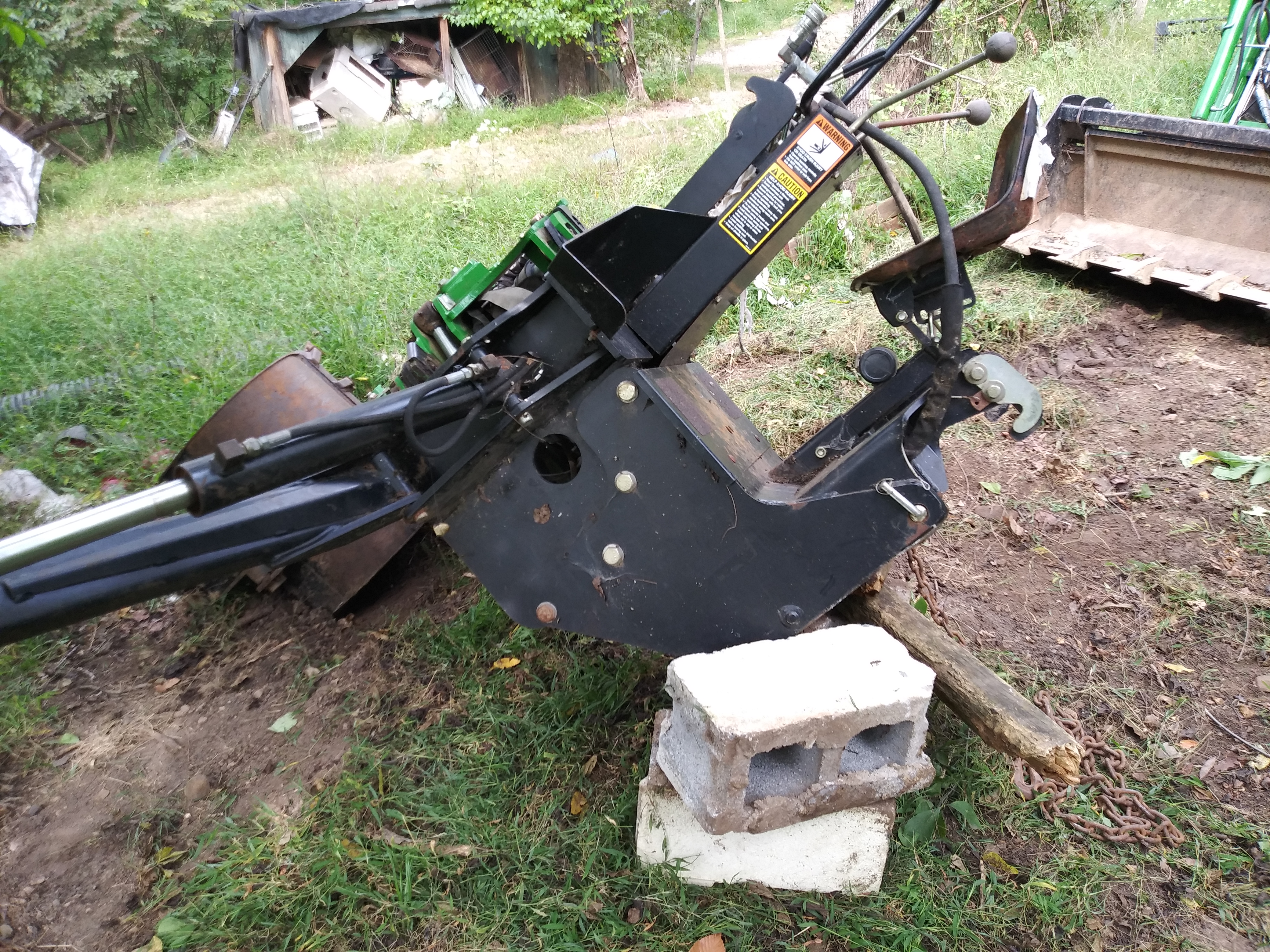 You might consider a little different approach to standing up the backhoe. Take a chain from the outside edge of your tractor bucket to the end of the stabilizer arm. Do that on both sides and keep the chains equal in length. Don't try to pickup the control section but take weight and back up slowly. As you move the control section back you may have to operate the backhoe swing controls and boom controls to relieve hydraulic pressure holding the boom in place.