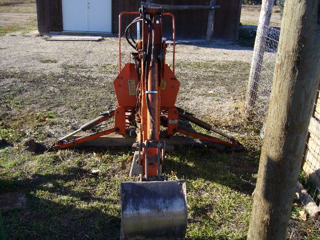 In the first pic you can see the rails that come forward and bolt on to the FEL subframe. The 'v' shaped area with the filter on it is the hydraulic reservoir with platforms for your feet on either side. Down where the PTO pump is resting you can see a round cross-bar. This is probably the biggest downside to the design, every time you change over to/from the hoe there are brackets that you bolt/remove on the rear differentatial. Slows things down and the previous owner was nice enough to strip out one of three bolts on each side. A heli-coil kit is on my shopping list ;) You also have to pull off the hitch and all the three point parts. My tires appear to be flipped 'inside out' so that the shallow part of the rim offset is on the inboard side, probably to increase the stance for more stability with the hoe. This means every time I take the bar for the liftarms out I have to take off one of the rear tires.