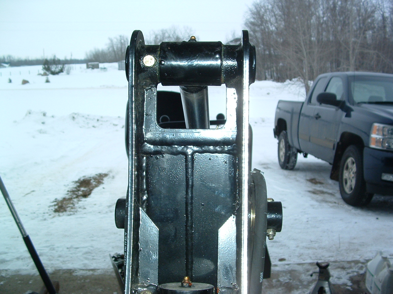 Frank I was so naive when buying my backhoe! I paid $2,300 (US) for it. Guy said he had only used it a couple times; it was included in a package deal when he bought his dozer. I had no reason to doubt him, just by looking at the wear marks, and lack of paint on the buckets. In no time at all I could tell I was in trouble! The guy who builds these only uses 3/8-inch plate for the pin mounts for the hydraulic cylinders. In short order the 1-inch pins were ob-longing the holes in the plate. My fix, which seems to be working very well. I took some 2 1/2-inch round stock, drilled 1-inch holes in it, drilled and tapped for grease fittings and welded the round stock to the plates, also drilled the hydraulic cylinders too.