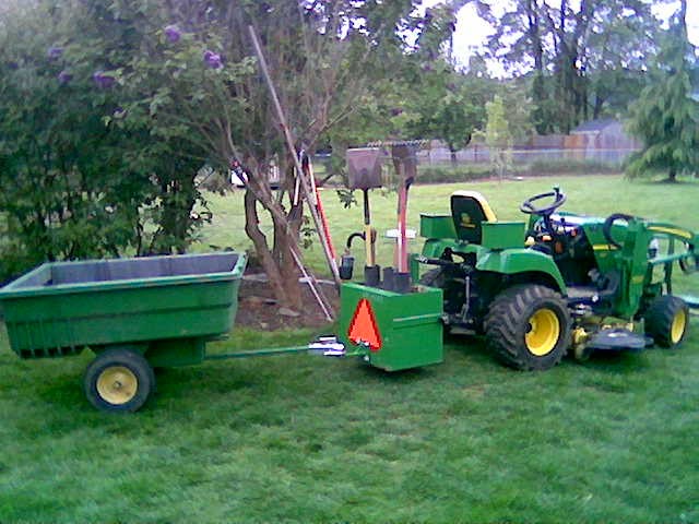 Now i finally don't have to drop my BB to hook up trailer! added traction and stability with full load of firewood or dirt in FEL. i fabbed this little unit up today at work. no more "levitating rear" or depending on what very little tongue weight my trailer offered to keep back end planted firmly when FEL is loaded! Thingy, if you are looking, how does the wire weld look? no short arc root, just pulse/sprayed it on. project took about 40 minutes. 5 holes, two cuts, and less than 1 minute of weld time including tack up.