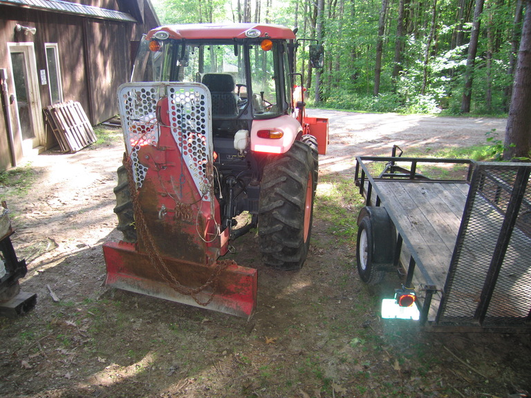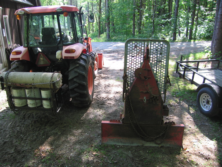 I typically run bale-spikes on my FEL so my brick-laden ballast box, carried low, is good to handle/transport a 6x5 round bale. "Low and slow" is the mantra for any FEL work. If I'm running my tiller or slasher off of the 3PH, I'll always put my 4in1 bucket on the FEL to counterbalance.