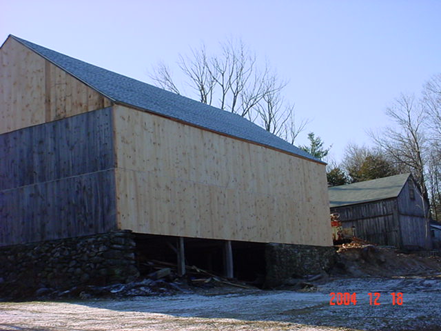 We finally got the front of the barn closed in. Now all that's left of the outside is to do the left side siding, install the windows and trim along the roof and finish laying new floorbaords inside. The right side roof will be shingled in the spring when it warms up and I will be replacing all the right side floor joists and planks inside the barn. The cows from years gone buy destoyed the old joists and floor boards. My winter will be spent rebuilding the old farmhouse so my daughter can move in hopefully next summer. I am going to be bored to death when this is over. I guess I'll have to find a real job again. The white speckles in the picture is snow falling today.