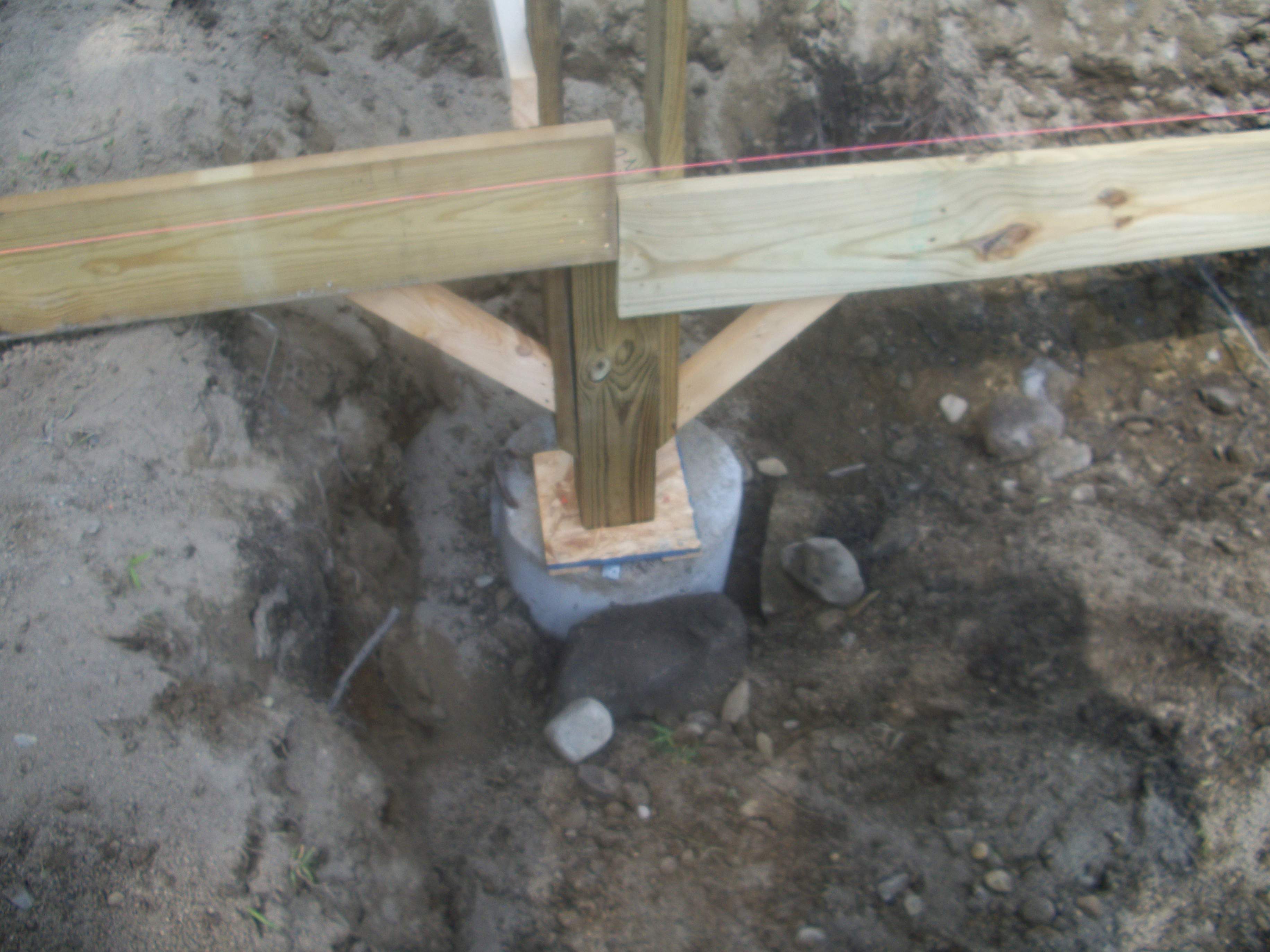 My initial question is still relevant though, and I can see now how the posts can be set precisely in line so that everything comes out plum and square. The drainage issue is probably the best advice I have seen regarding wood piers. I plan to backfill the holes with crushed stone or gravel and landscape so that water will run away from the posts and not collect at the base. I'm still not clear though on whether a concrete footing is appropriate. My thinking is that perhaps I would be better off with six or eight inches of large stone (maybe 1 1/2") at the bottom of the hole. This would allow moisture to percolate down and away from the end grain of the posts.