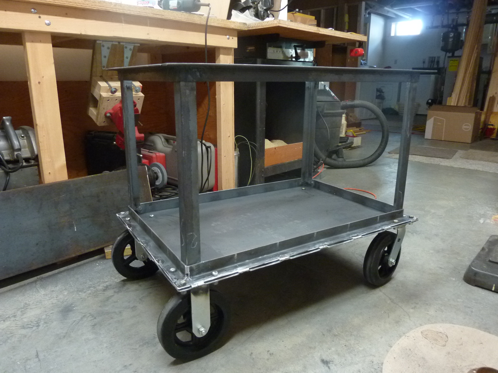 I don't have a welding bench. I make do with a 5' length of 3/8 plate 12" wide and a couple saw horses. Move it around, outdoors, garage, or basement like now. It gets old. I saw this thread and got inspired to build a 2' X 3' welding cart.