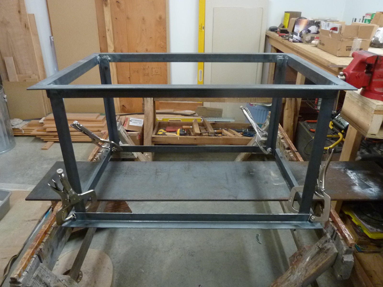 Now my question - when I finished welding the 4 legs the frame was racked so if I put it down like a 4 legged table one leg was off the floor 1/2". Understand I don't have a feel for what is or isn't a problem. My background is carpentry. The material is 1-1/2" X 3/16 angle. If I kneel on a short side and support my upper body on the other it takes very little pressure to straighten it out. If I clamp the other frame to the legs as if to weld it and let the structure free stand it becomes flat again. I plan on a 1/4" top and a 1/8" lower shelf with some belly bands.