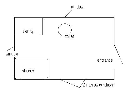 One window is placed at the wall opposite the main door near the shower placed at 5' tall so you can look out but if someone looked in they couldn't see much. The other window is just to the right of the toilet and up about 4 and a half feet. I will put two more long rectangle windows on the wall behind me near the dressing area, they will be placed high as well and will fit between the studs.