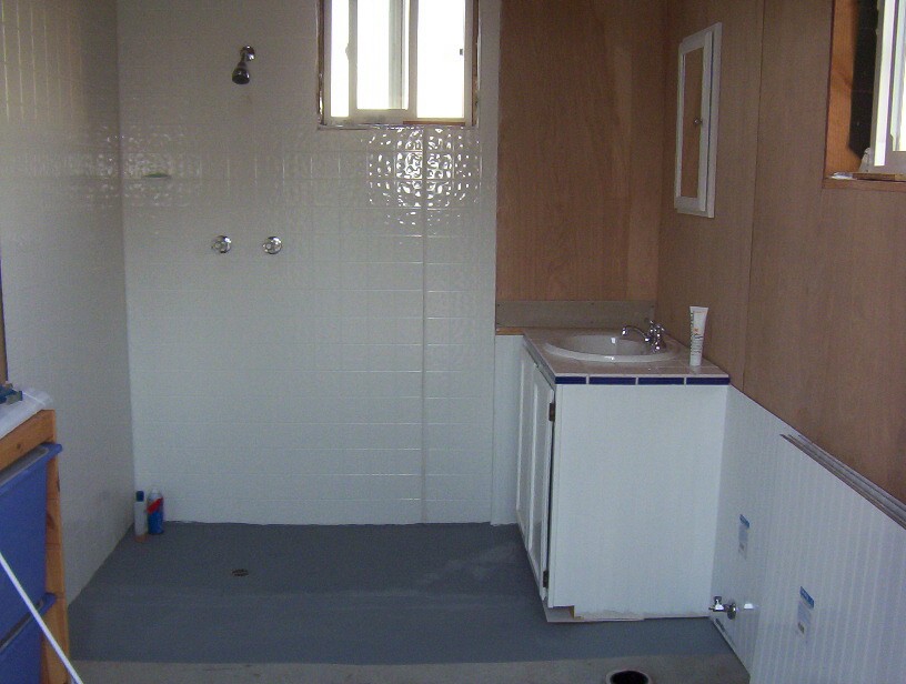 I still need to install the toilet, septic, finish the interior trim, put in the tile, bldg a pony wall for the shower, and shorten the Hot water flume.