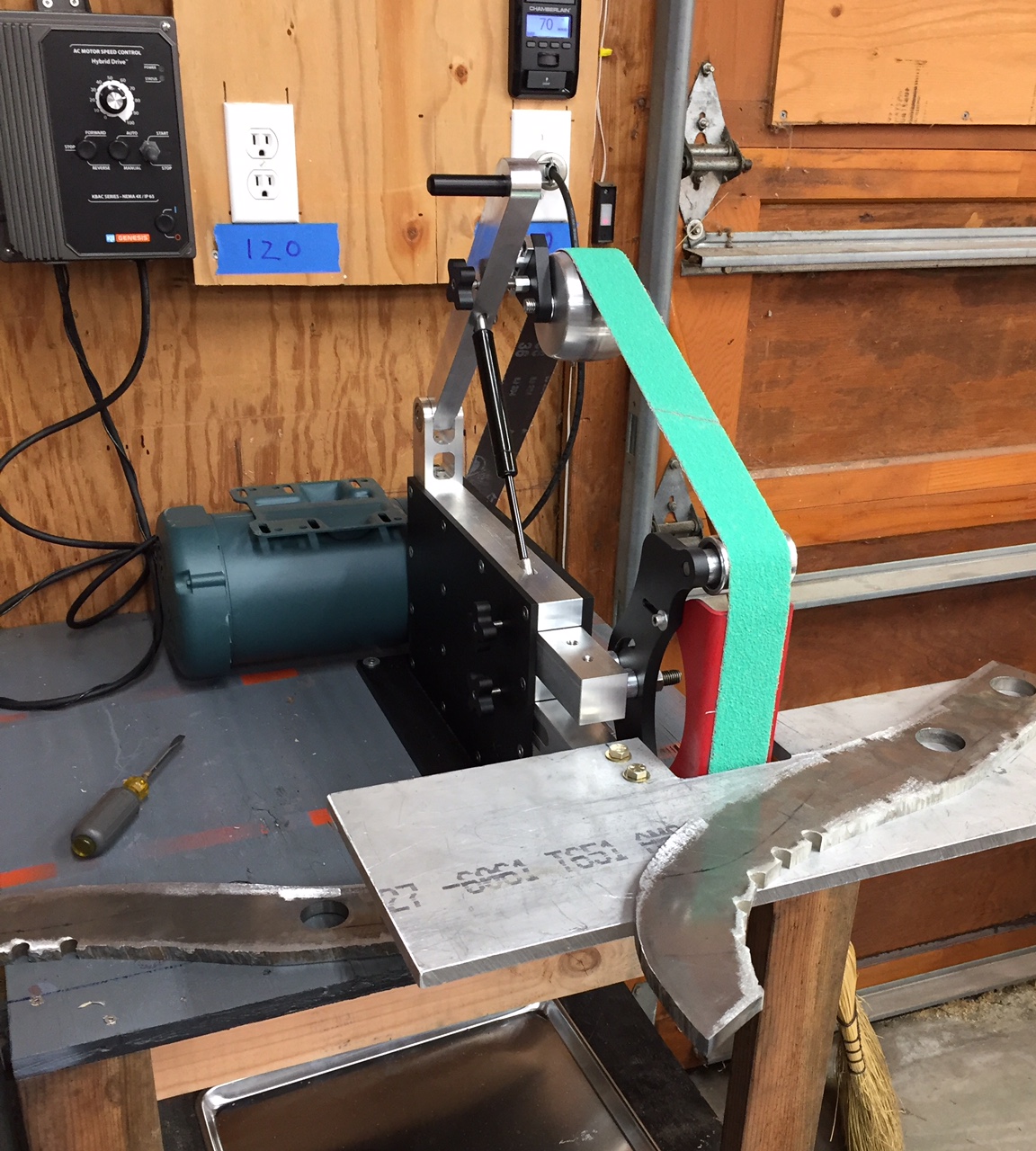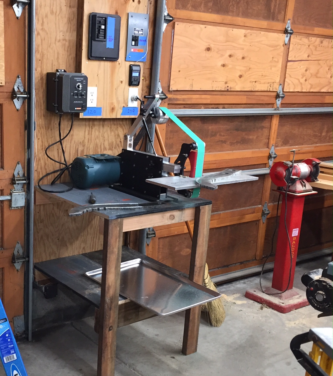 I wanted to make the grinder from scratch, which lots of folks do. But I have so many projects stacked up. I finally decided to buy it from an outfit called The Belt Grinder in Minnesota. It is wonderfully well made, everything CNC machined. I got the 2hp 3 phase Leeson motor from Surplus Center and the Variable Frequency Drive from KB. It took a day to make a bench and wire up the motor and VFD. I already had 240v power at various places.