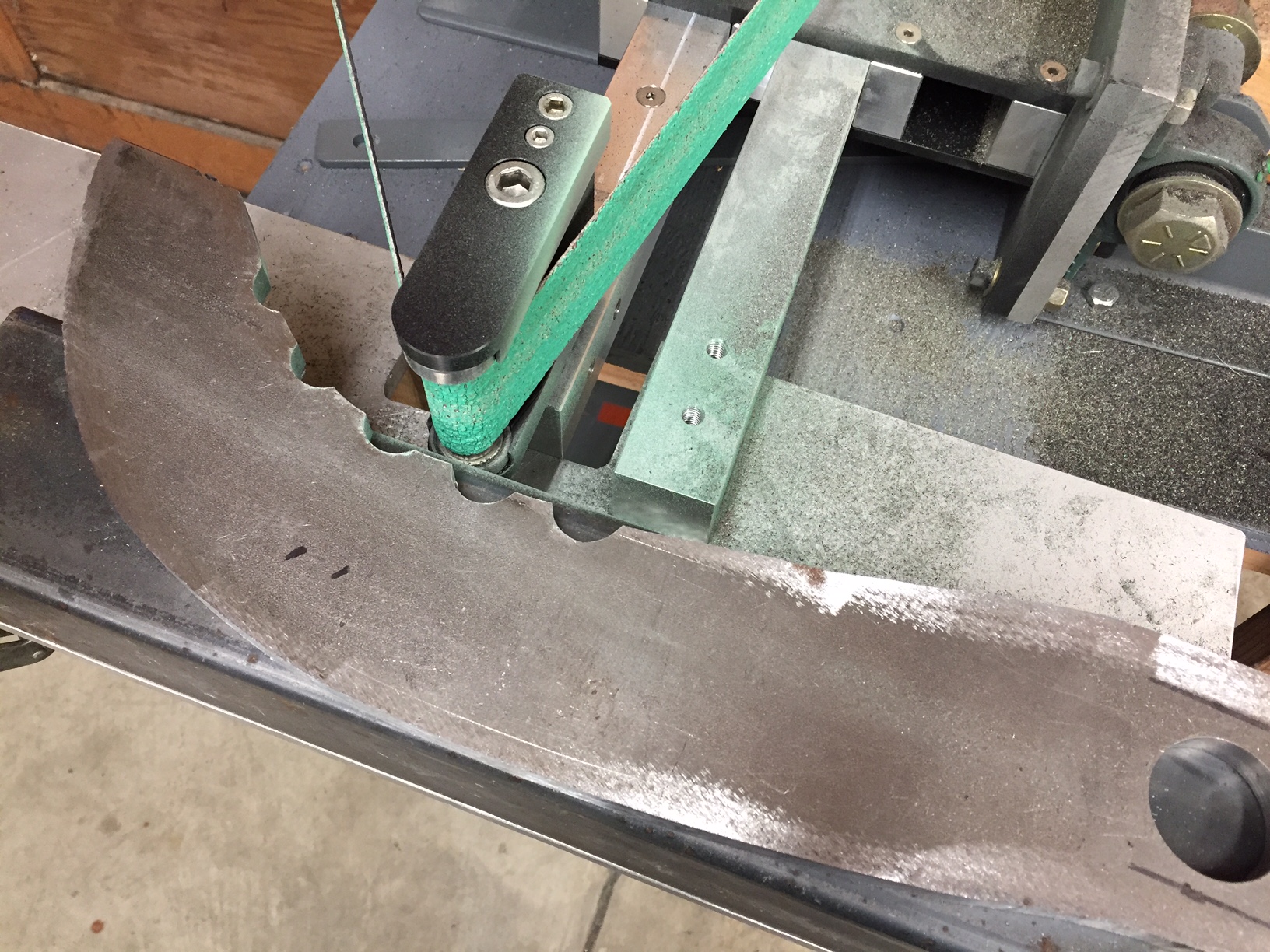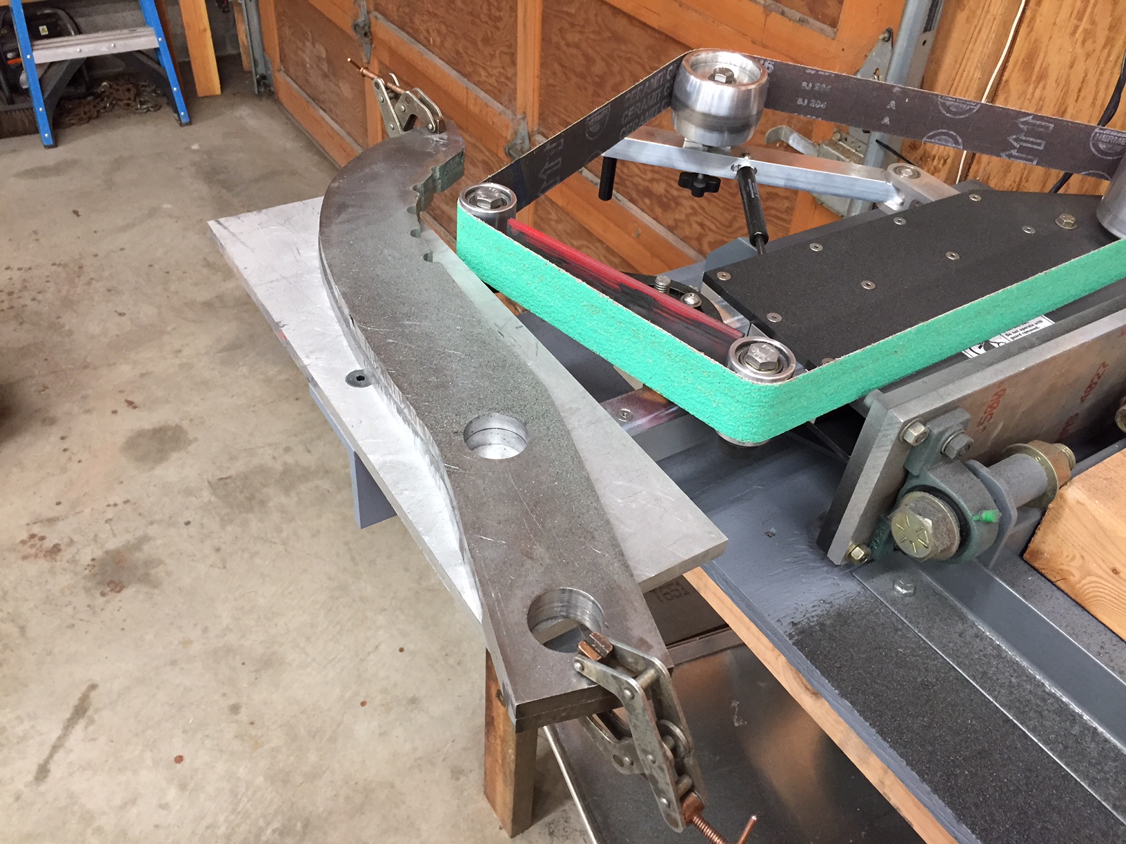 I haven't got to knife-making yet. The first job is to clean up the main rails of the new backhoe thumb I am making. At a belt speed of about 3600 feet per minute, with a 36 grit ceramic belt, the grinder chews through 1/2" steel very fast.