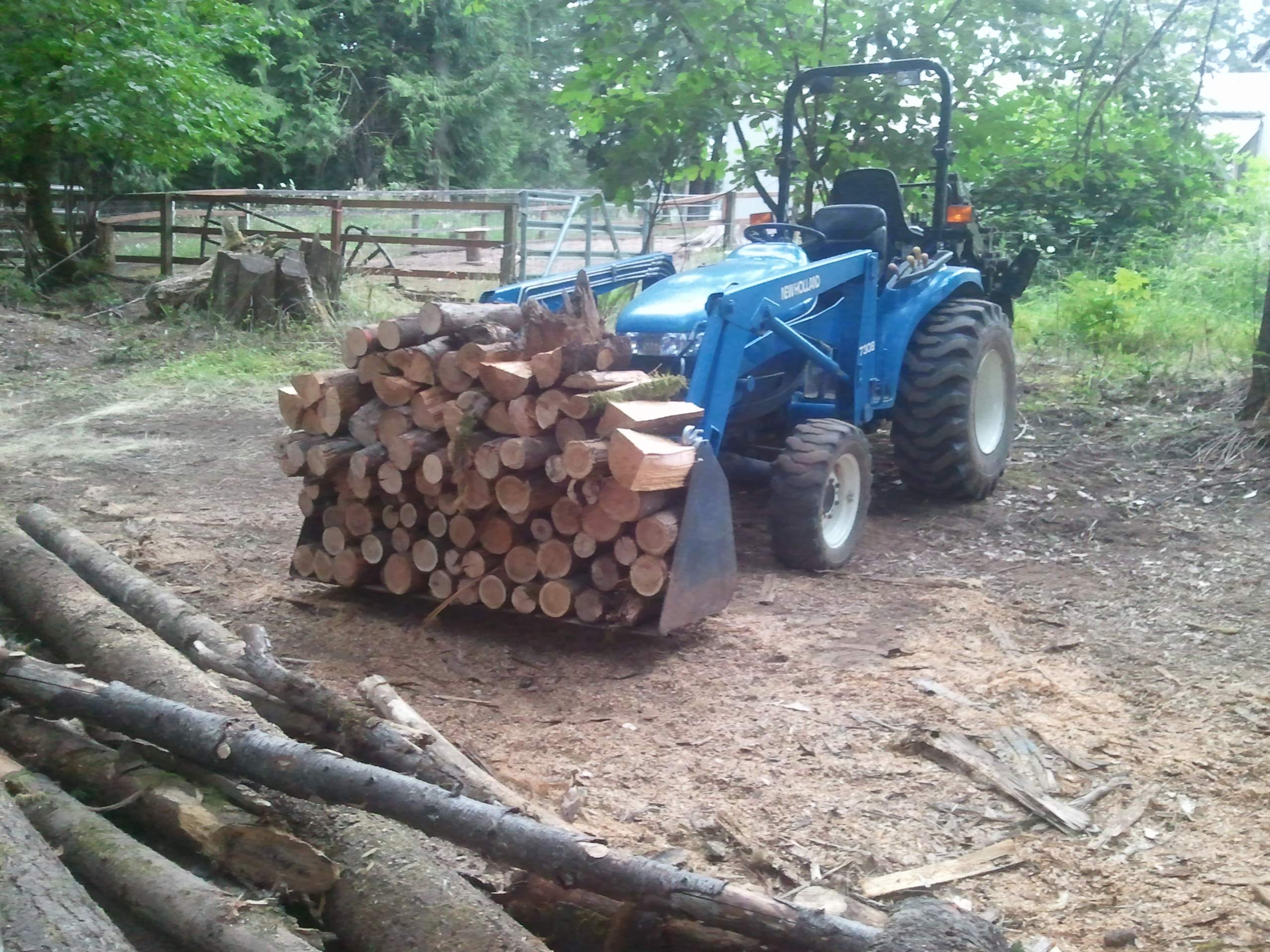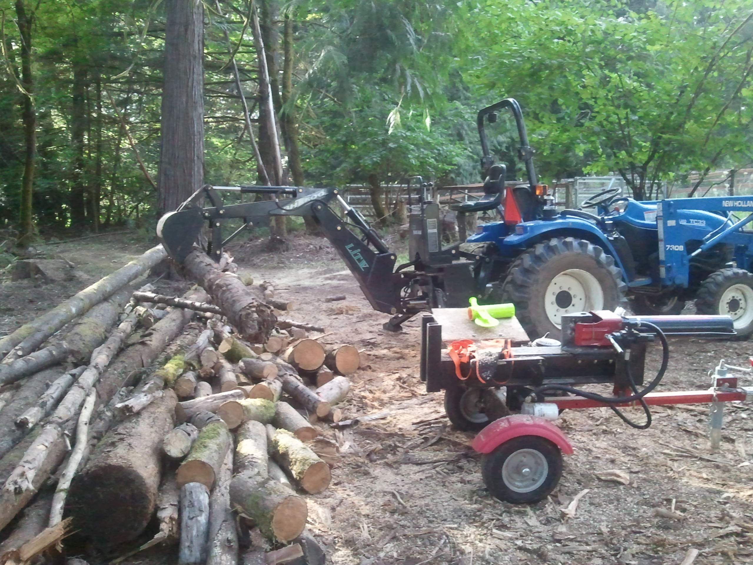 Here are a few pictures. These are smaller rounds here, but I've split as big as 36" in the vertical position. Another trick I use sometime is using the backhoe with thumb to lift the big rounds. :thumbsup: