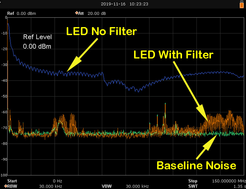 The top (blue)trace is the LED w/o filter, the orange trace is the LED with filter, and the green trace is the noise baseline. That green trace shows ambient radio stations and other misc transmitters and other RF sources my loose wires were picking up. The plot basically shows that at low frequencies (like around the AM band) the LED RFI levels were reduced by about 55 dB (a factor of about 3 million times less power). Higher up in frequency near the CB band the levels were reduced about 30 dB (a factor of about 1000 times less power). Even higher up in frequency near the FM radio band the levels were reduced about 35 dB (a factor of about 3000 times less power). So I am thinking when I refine the filter these numbers will be even better.