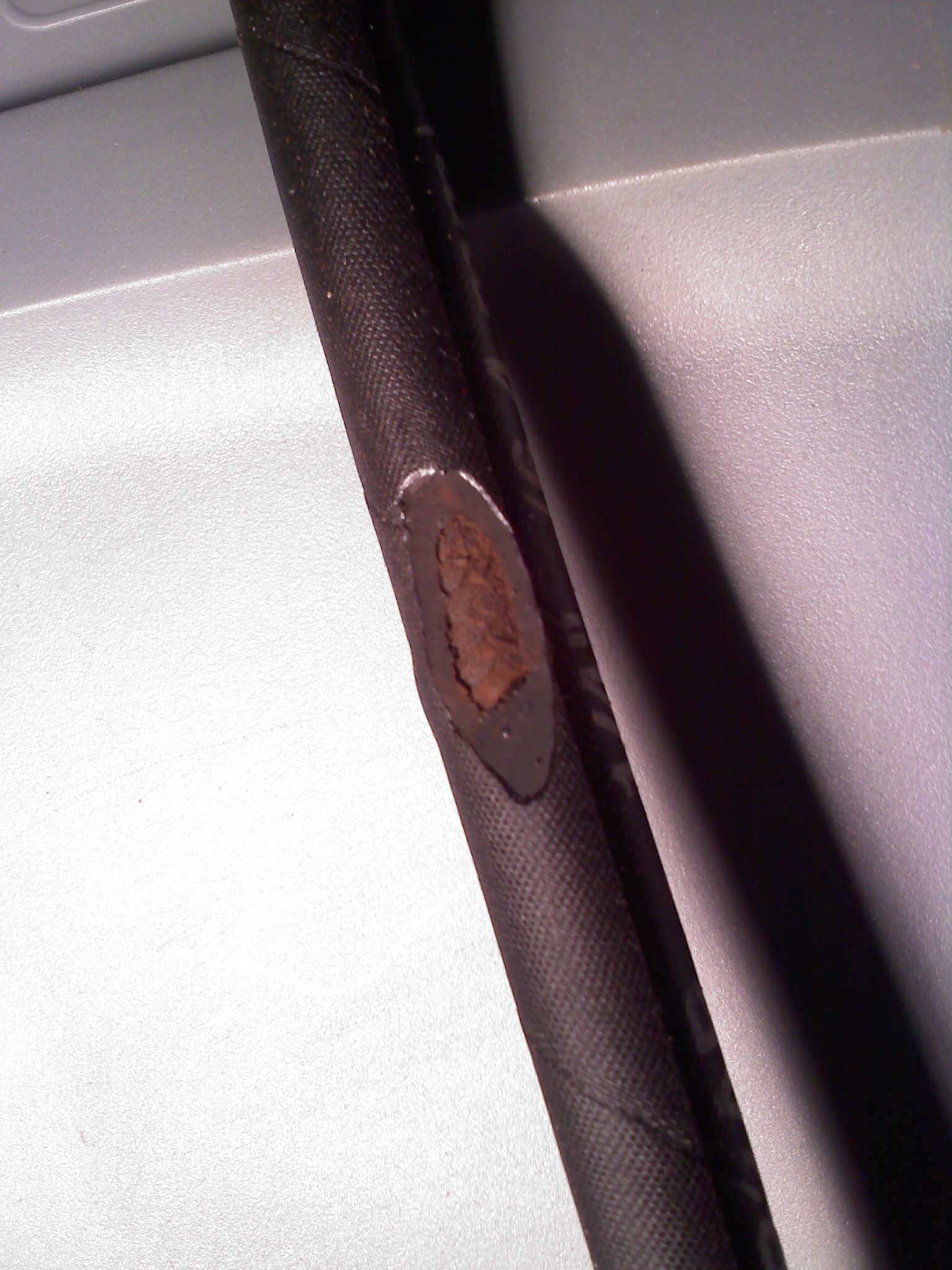 I decided to cut into the hose where they blew out to see what the steel reinforcement looked like - (pictures below) - it looked corroded to me, so then I cut open a part that was OK, it looked like normal shiny steel. Then I inspected the hoses carefully and noticed that there were some lumpy areas - so I cut these open as well - and found a bunch of rust under the rubber outer layer !