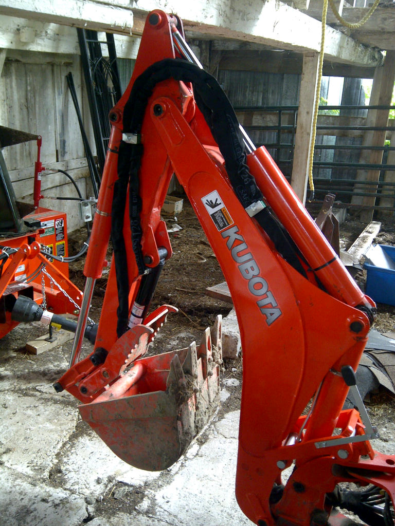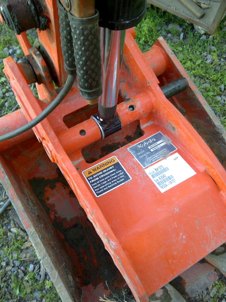 5) See the wear mark on the thumb about two inches down from the wrist pin (about halfway between the pins)? Another Kubota free feature. I think the base of the thumb hits the bucket when you go closed before the tips touch. I have the same problem starting. I will mark mine with a Sharpee marker tomorrow and show you where the interference is. This is a Kubota design error and has nothing to do with the Hydro addition. They hit with the Manual linkage too.
