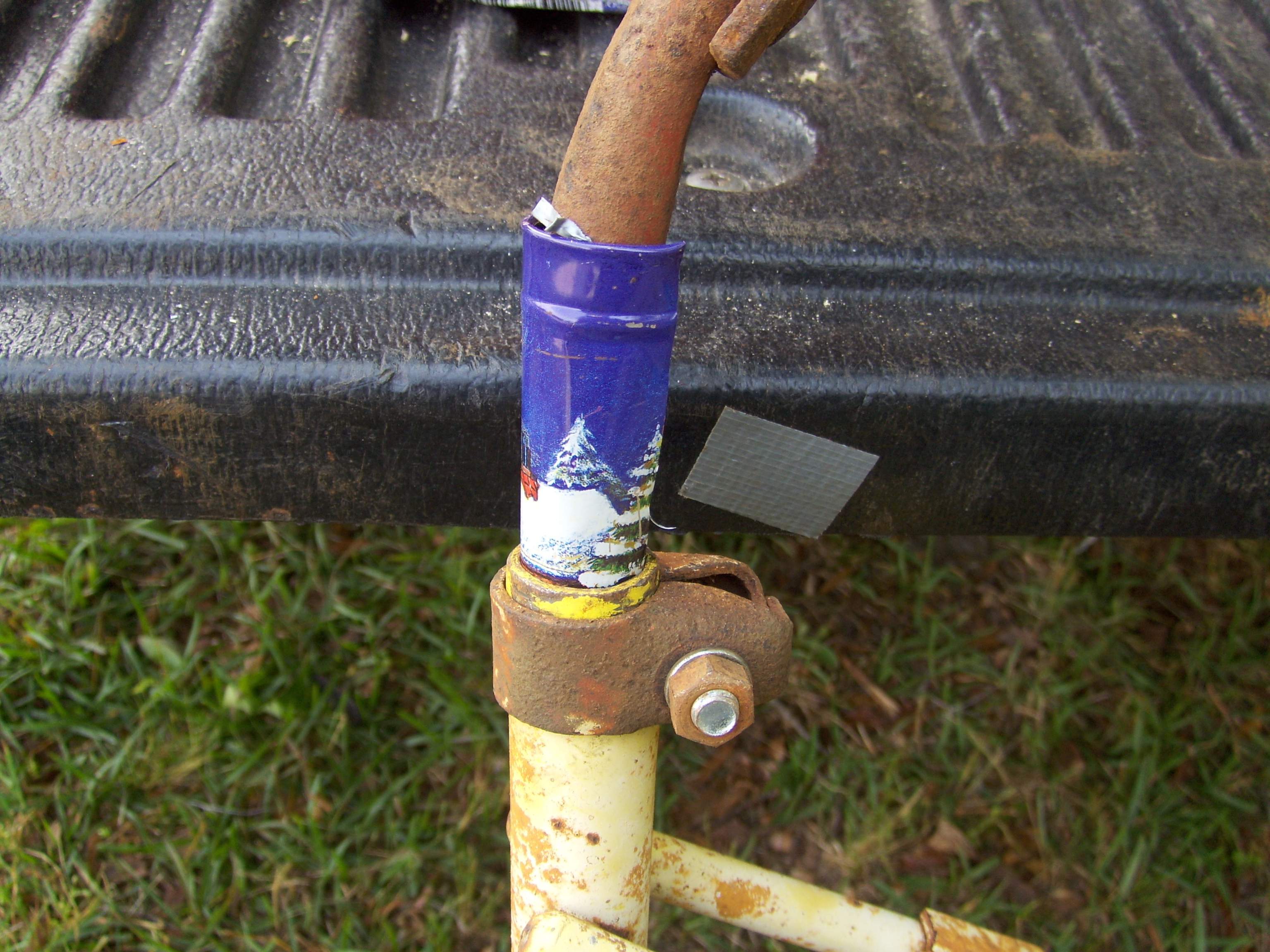 Margie found me this can that some Christmas "Luxury Wafers" came in. It was a little thicker and did the trick. I also located a new bolt for the seat clamp. Once I got the can cut down and in place, I was able to hammer the shaft down into the hole and tighten it up.
