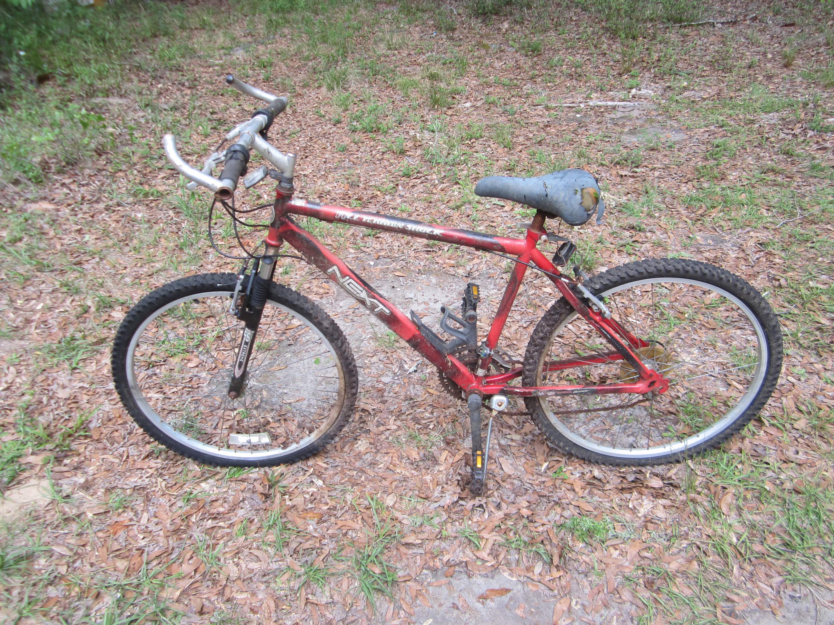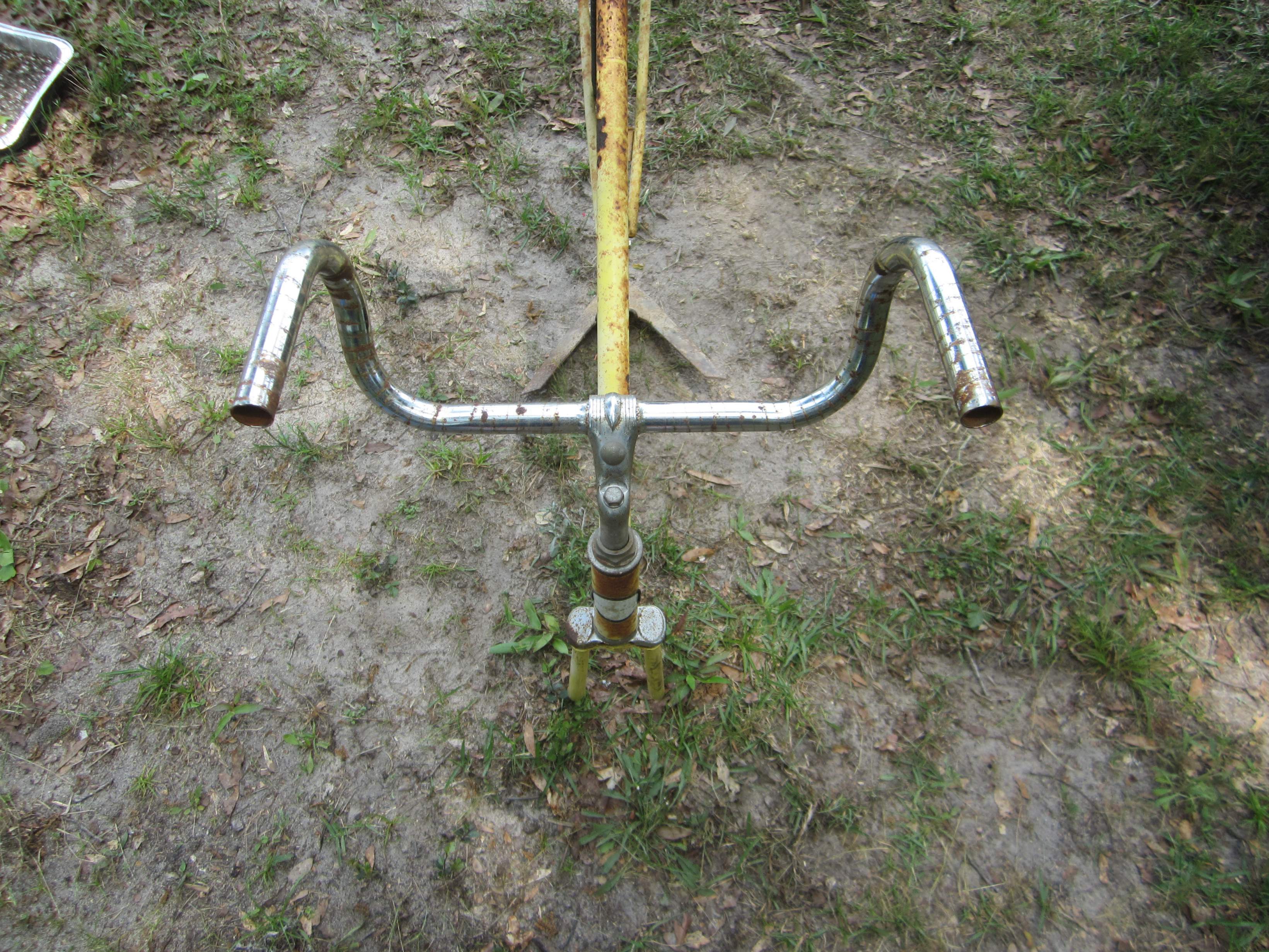 It is a little hard to steer with the handlebars being free to turn. I will do something to fix them in place. I also have an idea for the forks. But I have to buy a 1/4 inch bolt long enough to span them first. So unless I get into town in time to run by the hardware store before work tomorrow, that will have to wait until my Tuesday trip to town.