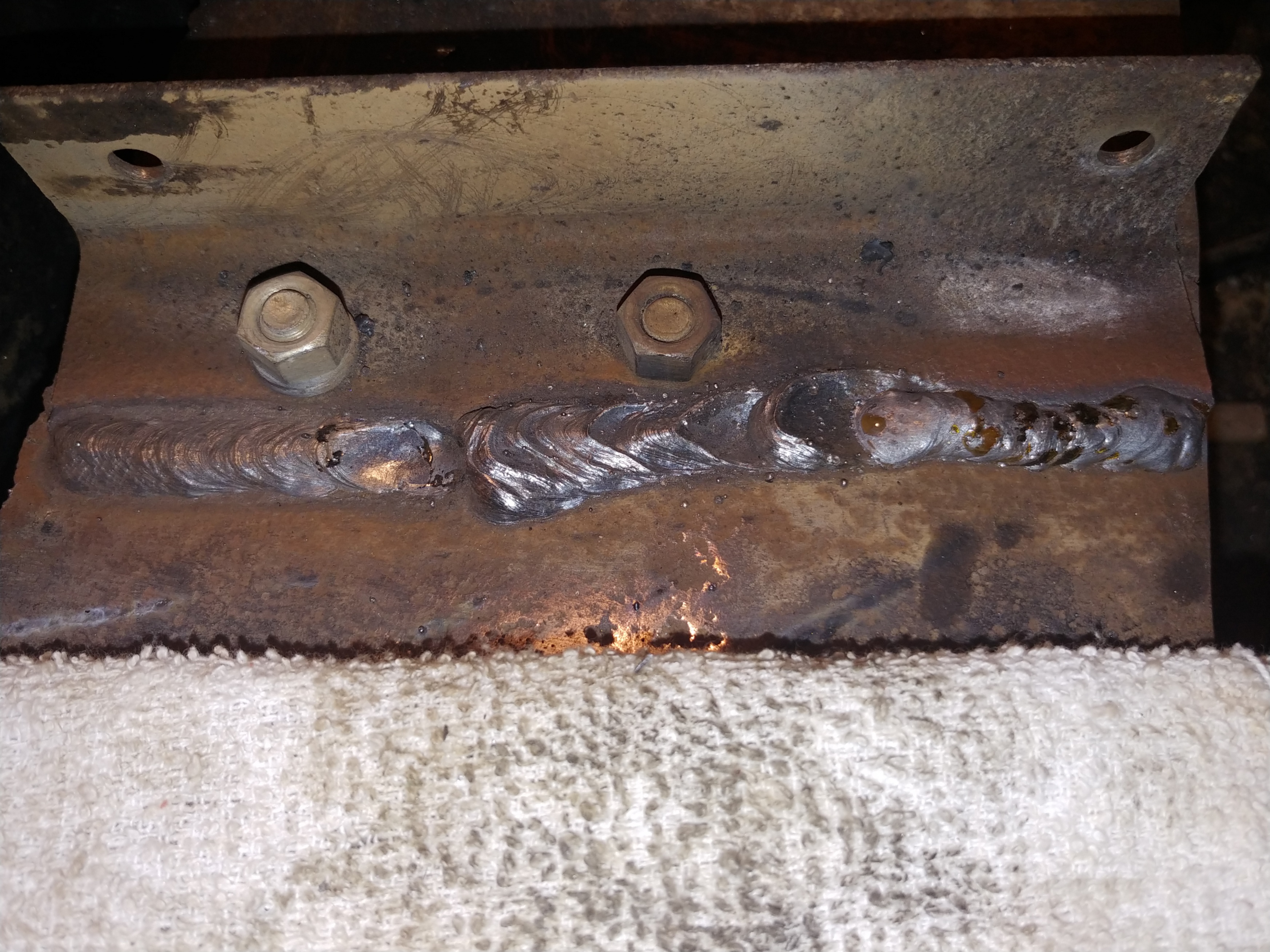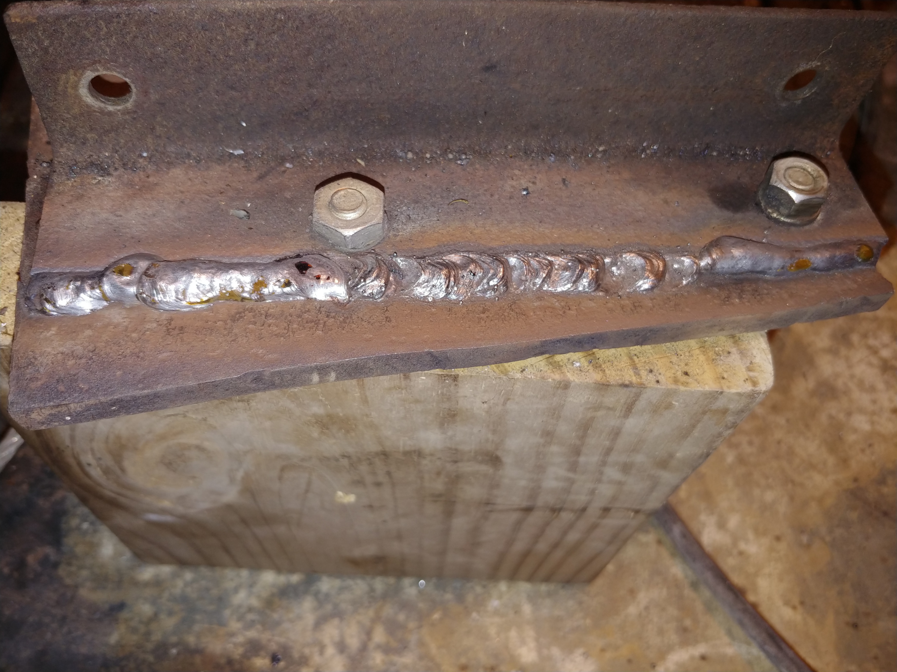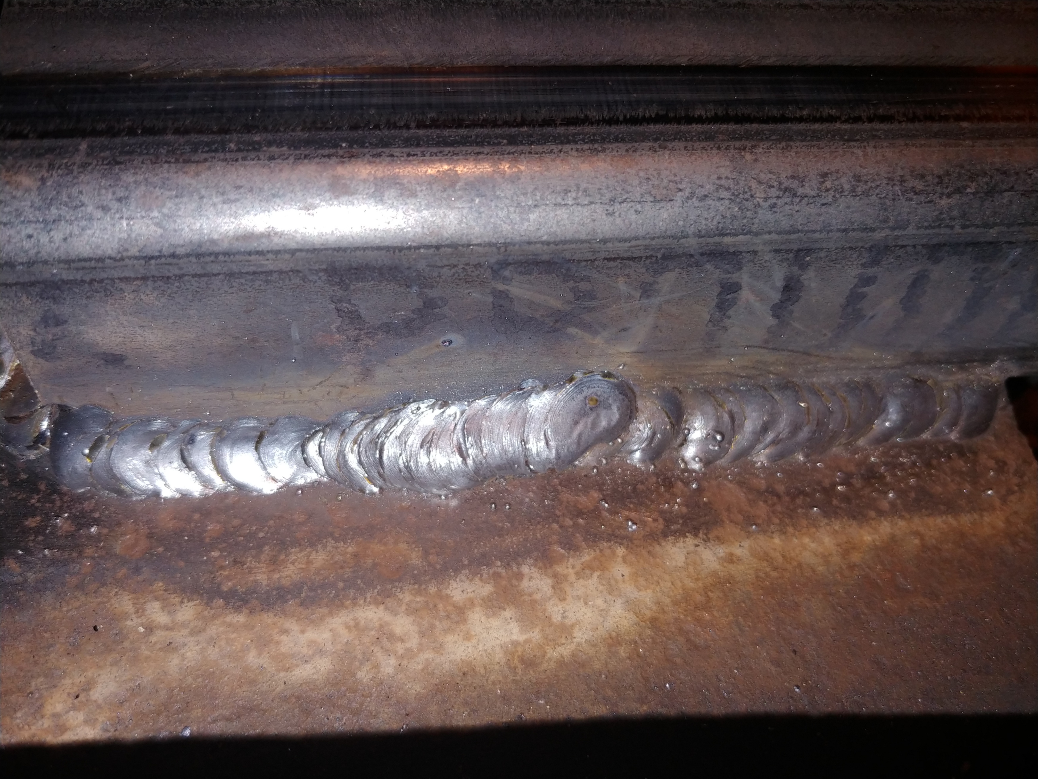 Left to right, first run was 1/8" 7018, next run was 1/8" 7014 - i didnt clean anything on that weld, total rust, had a lil trouble keeping the 7014 lit for some reason - 1/8 inch piece of angle on .345 thick place
