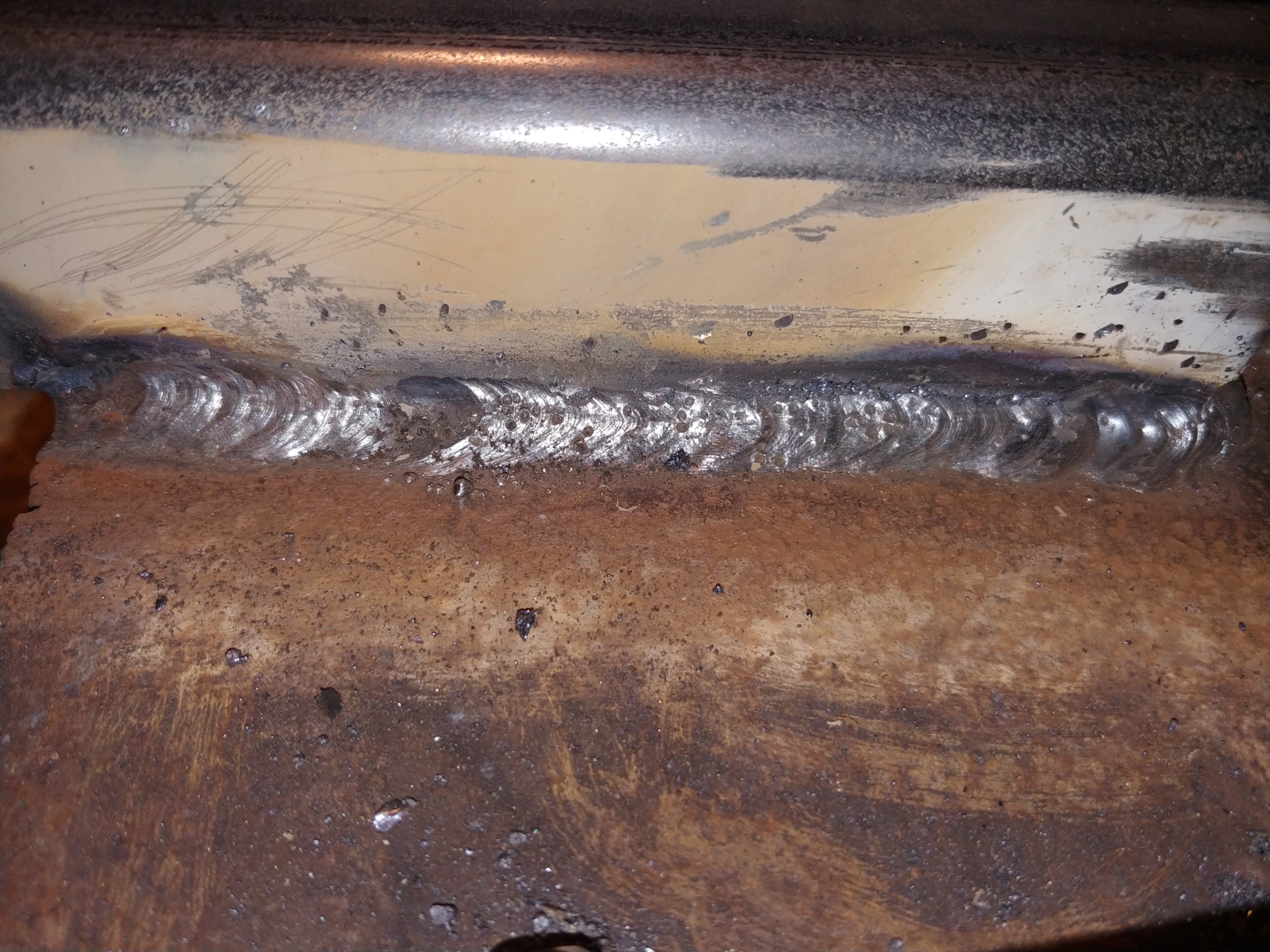 left to right, mig - center section 3/32 6011, had trouble keeping it lit - far right side i was trying to set manual mig settings to see if i could run different speed etc and find a way to see puddle better and it piled up on me with the mig.