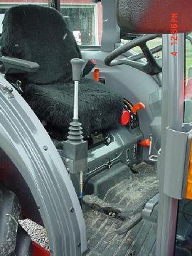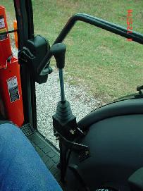 Here is another picture, this time from inside the cab. That's my knee in the picture. The joystick is right at arms length with your arm comfortably bent.