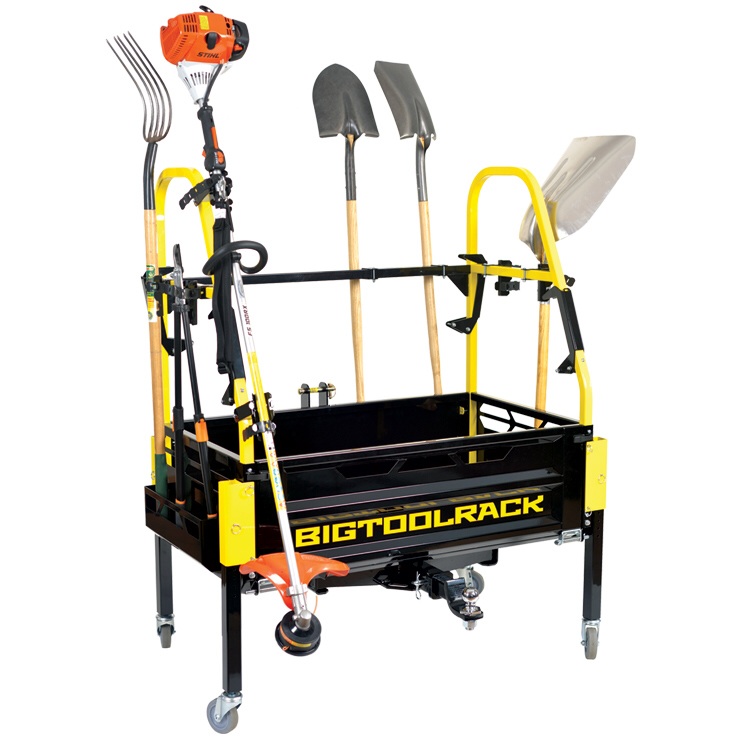 BigToolRack was designed with many unique feature: large cargo area, universal tool holders for rakes, shovels, axes, etc? long lumber / fence post carrier, weed trimmer carrier, garden hose / extension cord carrier, chainsaw carrier, counter weight option, trailer hitch feature, as well as a click on wheel system that converts your rack into a roll away storage system to neatly store your tools in your garage or barn when not in use. The real beauty is you can outfit your rack the way you want it to fit your needs. My system can be attached to your tractor with a 2 inch receiver or the 3pt hitch and still give you the ability to tow a trailer once the unit is attached. This rack has many uses! I spent a lot of time developing BigToolRack to make your life easier and more productive.