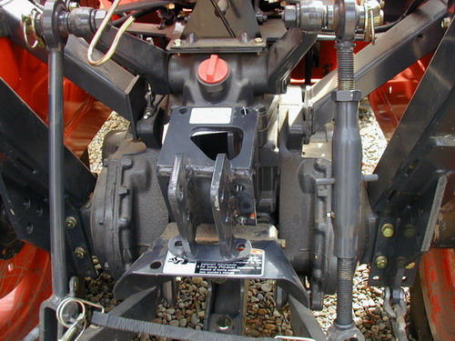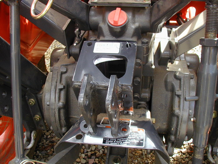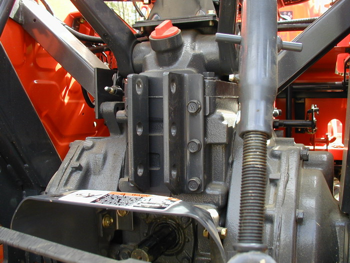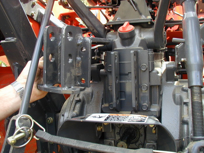 Here are pics of my "Kubota certified re-enforced bracket part" to beef up the top link bracket on the rear end housing recommended for heavy box blade and backhoe attachment. Also they have a heavy duty top link pin that goes in to this bracket. Previously ??? yr or so, a post was made with pics showing a rear end housing that had broken because this bracket was not installed along with a 3 pt hoe attachment and no subframe