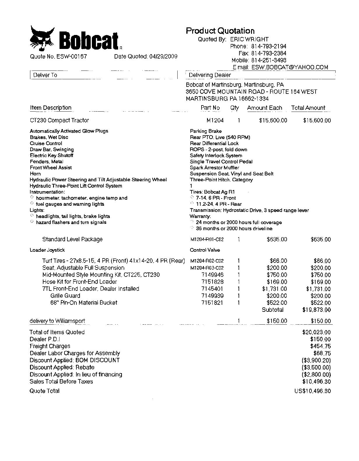 I called a Bobcat dealer today and he said $14000.00 for a CT230 after all rebates. Does anyone know of a dealer in Georgia or surrounding states that would like to sell a tractor? Or I will have to make a trip to NY!