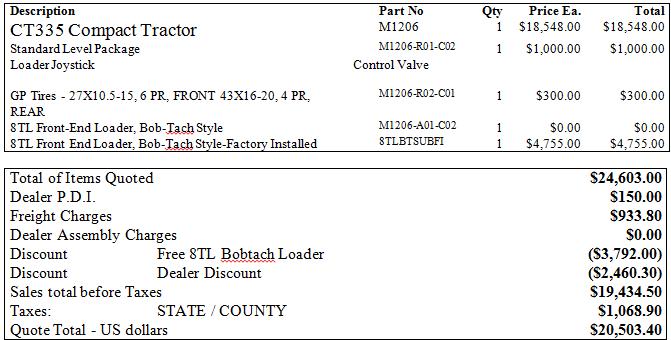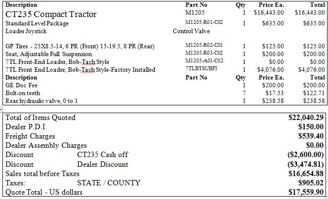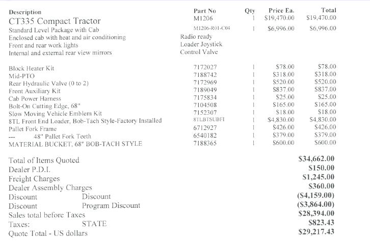 Here's what I paid last week for a CT445 with attachments. Compare that to the Bobcat webpage online price...you'll see an approx 18% additional discount from the dealer.I was looking at buying a 335SST and the price with free loader on Bobcat site with the additions I would like was about $19,600, I was wondering what I could expect for a price from a dealer. I have not purchased a tractor before and don't know what is a good price t expect from a dealer.
