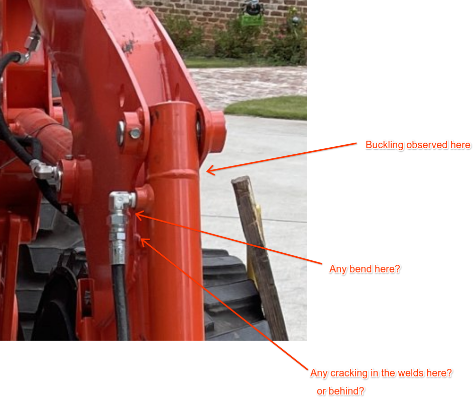And since it comes off easily I'd follow his suggestion to see if the various bushings and mounting points line up. Best way I can think of to do that is get some nice straight 5 and ten foot lengths of EMT 1/2 and 3/4" metal tubing at Home Depot. They are straight and cheap....then take the loader off, and put those lengths of EMT through the bushings from side to side and then stand back and see if you can determine if and where the bend is.